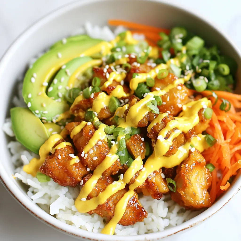 - 2 cups cooked jasmine rice - 1 pound chicken breast, diced - 1/2 cup cornstarch - 1/2 cup all-purpose flour - 1 tablespoon garlic powder - 1 tablespoon onion powder - 1 teaspoon cayenne pepper - Salt and pepper, to taste - 1/4 cup vegetable oil, for frying - 1/2 cup mayonnaise - 1/4 cup sweet chili sauce - 1 tablespoon sriracha - 1 cup green onions, chopped - 1 cup shredded carrots - 1 avocado, sliced - Sesame seeds, for garnish The ingredients for the Bang Bang Chicken Bowl are fun and easy to use. You start with 2 cups of cooked jasmine rice. This rice is fluffy and has a lovely aroma. Next, use 1 pound of diced chicken breast for the protein. The chicken will soak up all the flavors. You will need cornstarch and all-purpose flour. Each of these helps make the chicken crispy. Garlic powder and onion powder add a nice kick. The cayenne pepper gives it a spicy touch, but you can adjust it to your taste. Remember to add salt and pepper to bring all the flavors together. For frying, you need 1/4 cup of vegetable oil. This will help the chicken turn golden brown. The creamy sauce is key to this dish. Mix 1/2 cup of mayonnaise with 1/4 cup of sweet chili sauce and 1 tablespoon of sriracha. This makes a tasty Bang Bang sauce. Don’t forget the fresh toppings! Use 1 cup of chopped green onions and 1 cup of shredded carrots. They add color and crunch. Finally, slice up 1 avocado and sprinkle sesame seeds for garnish. These ingredients make this bowl not just tasty but also beautiful! {{ingredient_image_1}} To make the Bang Bang sauce, start by mixing three simple ingredients. In a medium bowl, combine 1/2 cup mayonnaise, 1/4 cup sweet chili sauce, and 1 tablespoon sriracha. Stir everything well until smooth and creamy. Set this aside for later. This sauce gives a sweet and spicy kick that makes the bowl special. Next, we will coat the chicken. In a separate bowl, mix 1/2 cup cornstarch, 1/2 cup all-purpose flour, 1 tablespoon garlic powder, 1 tablespoon onion powder, 1 teaspoon cayenne pepper, and a pinch of salt and pepper. This mixture will create a crunchy coating. Dredge the diced chicken breast in this dry mixture. Make sure each piece is well coated for extra crunch. Now it’s time to cook the chicken. Heat 1/4 cup of vegetable oil in a large skillet over medium-high heat. Once the oil is hot, carefully add the coated chicken pieces. Fry them for about 5 to 7 minutes. Cook until they turn golden brown and are cooked through. When done, remove them from the skillet and drain on paper towels to get rid of excess oil. As you assemble the bowl, start with a base of 2 cups of cooked jasmine rice. Then, add the crispy chicken on top. Drizzle the Bang Bang sauce generously over the chicken. For added color and crunch, top with 1 cup of shredded carrots, 1 cup of chopped green onions, and slices of 1 avocado. Finally, sprinkle sesame seeds over everything to finish. This bowl is not just tasty, it looks amazing too! To get that perfect crisp, use cornstarch and flour. This mix helps the chicken fry up nice and crunchy. Dredge the chicken pieces well. Make sure they are fully coated. Don’t rush the frying. Fry the chicken in hot oil for 5-7 minutes. Watch for a golden color. Drain the chicken on paper towels after frying. This step keeps them crispy. If you want more heat, add more cayenne pepper. Start with one teaspoon of cayenne. You can also adjust the sriracha in the Bang Bang sauce. Taste as you go. Remember, you can always add heat, but you can’t take it away. This way, you can make it just right for your taste. You can make the Bang Bang sauce a day before. Store it in the fridge in a sealed jar. The flavors will blend nicely overnight. You can also cook the chicken ahead of time. Just reheat it in the oven for a few minutes. This keeps the chicken crispy. Prepare your rice in advance too. This makes your meal quick and easy on busy days. Pro Tips Double Fry for Extra Crispiness: For an even crunchier chicken, fry the chicken pieces twice. First, fry until they are cooked through, then let them rest for a few minutes before frying again until golden brown. Customize Your Sauce: Feel free to adjust the sweetness and heat of the Bang Bang sauce by adding more sweet chili sauce or sriracha. Taste as you mix to find your perfect balance. Use Fresh Ingredients: Fresh green onions and ripe avocados will enhance the flavor and presentation of your bowl. Always opt for the freshest produce available. Serve Immediately: For the best experience, serve the bowls immediately after assembling. This ensures the chicken stays crispy and the ingredients remain fresh and vibrant. {{image_2}} You can easily make a vegan version of the Bang Bang Chicken Bowl. Instead of chicken, use crispy tofu or tempeh. These options soak up flavor well and add protein. Make sure to coat the tofu in the same dry mixture as the chicken. Fry it until it’s golden and crispy. The Bang Bang sauce works great with these vegan proteins. You can still enjoy jasmine rice, shredded carrots, green onions, and avocado for a colorful meal. For a gluten-free Bang Bang Chicken Bowl, swap the all-purpose flour with a gluten-free flour blend. You can use rice flour or almond flour too. Cornstarch is already gluten-free, so you can keep that. Be sure to read labels on sauces like mayonnaise and sweet chili sauce to avoid gluten. Enjoy your crispy chicken with the same tasty toppings, and you’ll have a delicious meal without gluten. Make your Bang Bang Chicken Bowl even more exciting with extra toppings. Try adding sliced radishes for a crunchy bite. Pickled cucumbers bring a nice tang. You can also toss in some edamame for added protein. Fresh herbs like cilantro or basil can add a burst of flavor. Feel free to mix and match based on your taste. The key is to have fun and enjoy your meal. To store leftovers, first let the bowl cool down. Place the rice, chicken, and toppings in separate airtight containers. This keeps everything