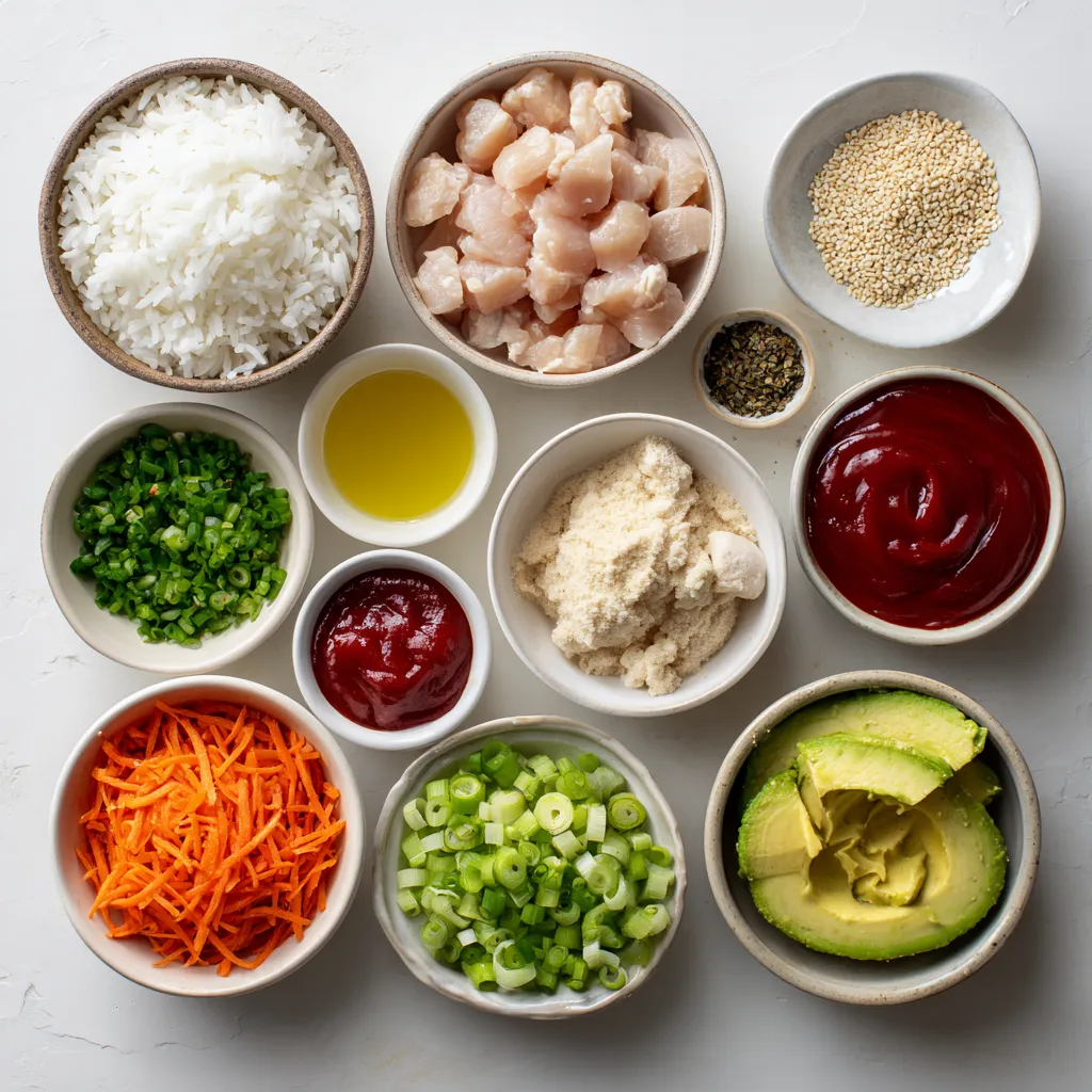 The ingredients for the Bang Bang Chicken Bowl are fun and easy to use. You start with 2 cups of cooked jasmine rice. This rice is fluffy and has a lovely aroma. Next, use 1 pound of diced chicken breast for the protein. The chicken will soak up all the flavors.