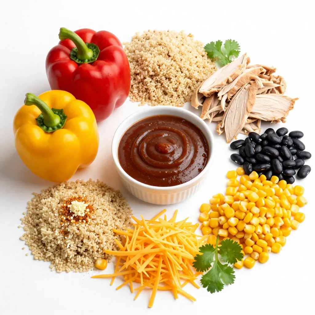 For this BBQ chicken stuffed peppers recipe, you need fresh ingredients that pack flavor. The bell peppers serve as a tasty bowl for the filling. You can use any color: red, green, yellow, or orange. Each will add a unique taste.