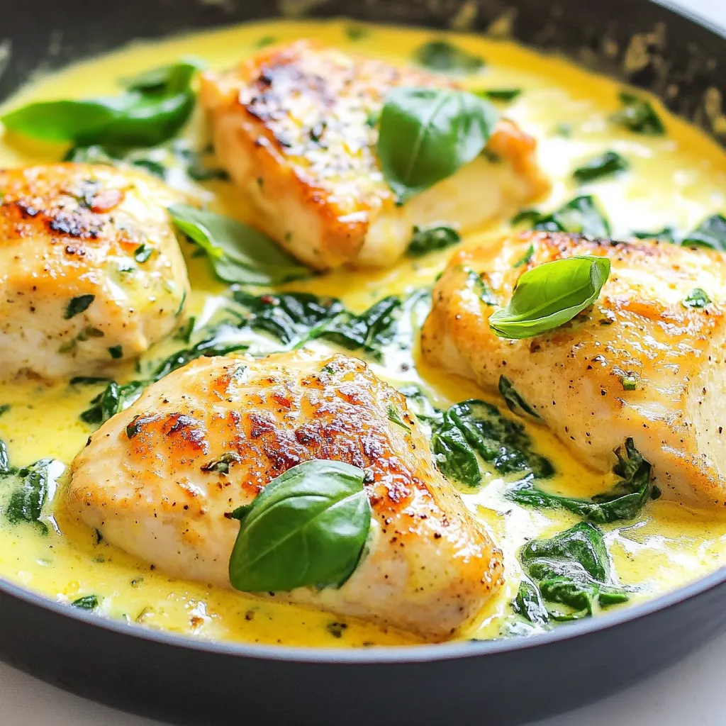 • Combine Chicken with Sauce: Return the chicken breasts to the skillet, coating them with the creamy spinach sauce. Simmer for another 2 minutes to heat through.