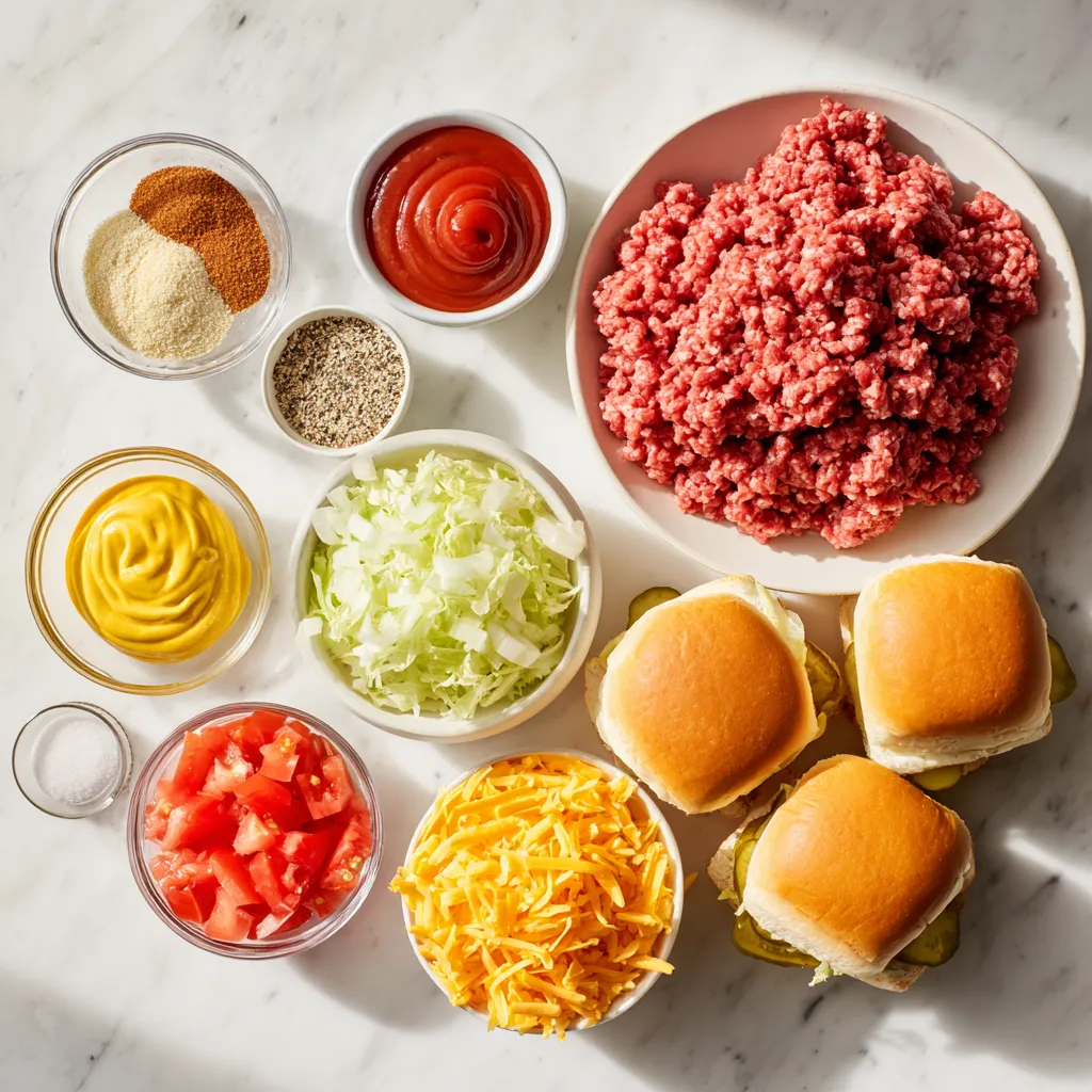 To start, gather all your ingredients. You will need ground beef, spices, cheese, and buns. Preheat your oven to 350°F (175°C). This helps the sliders cook evenly. Line a baking dish with parchment paper for easy cleanup.