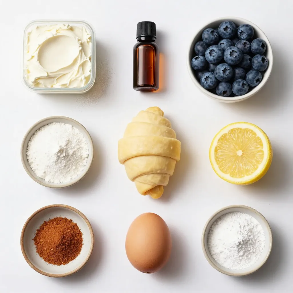 Each ingredient plays a key role. The cream cheese gives it a smooth, rich filling. Granulated sugar adds sweetness. Vanilla extract boosts the flavor. Refrigerated crescent dough creates a flaky base. Fresh blueberries provide a burst of flavor and color. Cornstarch thickens the blueberry mixture. Lemon juice adds a zesty kick. Cinnamon warms the taste. The egg wash gives a shiny, golden finish. Finally, powdered sugar is the sweet touch on top.