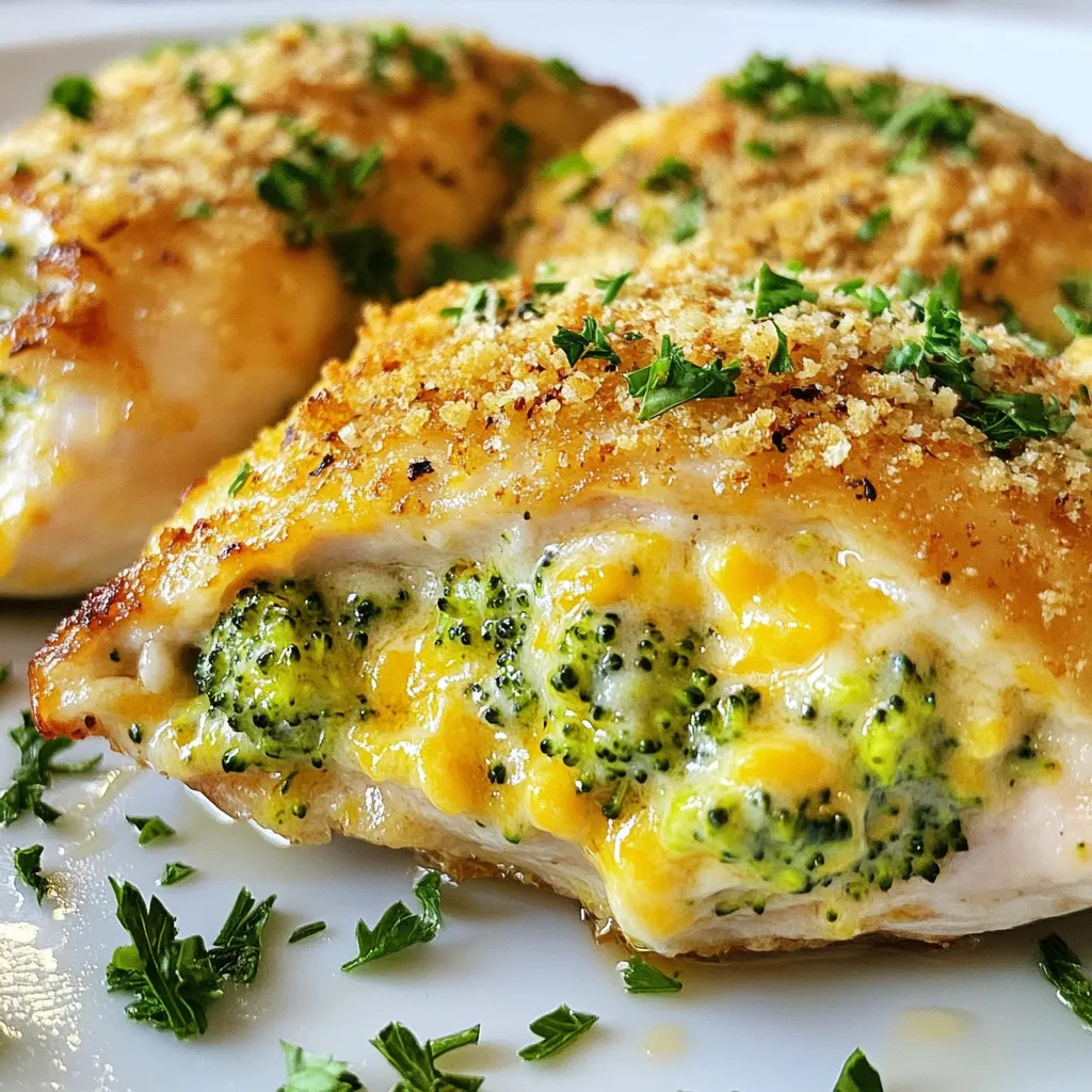 - 4 boneless, skinless chicken breasts - 1 cup fresh broccoli florets, chopped small - 1 cup shredded cheddar cheese - 1/2 cup cream cheese, softened - 1/4 teaspoon garlic powder - 1/4 teaspoon onion powder - 1/4 teaspoon black pepper - Salt to taste - 2 tablespoons olive oil - 1/4 cup breadcrumbs (optional for topping) - Fresh parsley, chopped (for garnish) To create this tasty dish, gather all the ingredients first. The chicken breasts serve as the main feature. They hold the creamy, cheesy filling inside. Fresh broccoli adds color and crunch. Cheddar cheese gives that rich, savory flavor. Cream cheese makes the filling smooth and creamy. Next, seasonings like garlic powder and onion powder enhance the taste. Black pepper and salt bring out all the flavors. Olive oil is key for searing the chicken and adding richness. If you want extra crunch, consider adding breadcrumbs on top. For a pop of color, garnish with fresh parsley. This dish is sure to impress with its hearty and savory flavors. {{ingredient_image_1}} 1. First, preheat your oven to 375°F (190°C). This step gets your oven ready for baking. 2. In a medium bowl, mix together the chopped broccoli, shredded cheddar cheese, softened cream cheese, garlic powder, onion powder, black pepper, and salt. Stir well until everything is creamy and well-combined. - To create pockets in the chicken breasts, place each one on a cutting board. Carefully cut a pocket into the side of each breast. Make sure not to cut through the other side. - Next, fill each pocket with the broccoli cheese mixture. Use your hands to stuff them generously, ensuring even filling in each breast. 1. Heat two tablespoons of olive oil in a large skillet over medium heat. Once the oil is hot, add the stuffed chicken breasts to the skillet. 2. Sear each side for about 3-4 minutes until they turn a nice golden brown. This step adds great flavor. 3. After searing, transfer the chicken to a baking dish. If you want, sprinkle breadcrumbs on top for extra crunch. 4. Bake the chicken in your preheated oven for 20-25 minutes. Check that the internal temperature reaches 165°F (75°C) to ensure it's fully cooked. 5. When done, take the chicken out and let it rest for about 5 minutes. This helps keep it juicy. 6. Finally, garnish with chopped parsley before serving. This adds a pop of color and freshness to your dish. - How to achieve the best flavor Start with fresh, quality ingredients. Fresh broccoli brings a bright taste. Use sharp cheddar for a stronger cheese flavor. Mixing garlic and onion powder adds depth. A sprinkle of salt enhances all the flavors. - Tips for tender chicken Always pound the chicken breasts to an even thickness. This ensures they cook evenly. Searing the chicken in olive oil adds a nice crust. Baking it afterward keeps it juicy. Letting the chicken rest before slicing helps retain moisture. - Ideal side dishes Serve this dish with a light salad for balance. Roasted vegetables pair well for added nutrition. Mashed potatoes or rice can soak up the cheesy goodness. A side of garlic bread is also a hit. - Presentation ideas for serving Slice the chicken in half to show off the colorful stuffing. Arrange on a nice plate with fresh parsley on top. Drizzle a little olive oil or balsamic glaze for shine. Use a colorful side to make the plate pop. Pro Tips Use Fresh Broccoli: Fresh broccoli will give a better texture and flavor compared to frozen. Make sure to chop it finely for even stuffing. Seal the Chicken Well: Ensure the chicken pockets are fully sealed after stuffing to prevent the filling from spilling out during cooking. Experiment with Cheeses: Feel free to mix different types of cheese such as mozzarella or gouda for varied flavors and textures. Check for Doneness: Always use a meat thermometer to check the internal temperature of the chicken, ensuring it reaches 165°F (75°C) for safe consumption. {{image_2}} You can make Broccoli Cheese Stuffed Chicken even more fun by changing a few ingredients. - Using different cheeses: Swap cheddar for mozzarella or pepper jack. Each cheese brings a unique flavor. For a more robust taste, try gouda or feta. They melt well and add a nice twist. - Alternative vegetables for stuffing: You don’t have to stick with broccoli. Try spinach, kale, or bell peppers instead. Each veggie pairs nicely with cheese and chicken. You can even mix veggies for added texture and taste. Switching up how you cook your chicken can lead to tasty results. - Grilling vs. baking: Grilling gives a smoky flavor. Cook the stuffed chicken on medium heat until it reaches 165°F (75°C). Baking is easy and keeps the chicken juicy. Just follow the oven instructions for great results. - Instant Pot or slow cooker method: For a quicker meal, use an Instant Pot. Cook on high pressure for about 10 minutes. For a rich flavor, use a slow cooker. Cook on low for 6-8 hours. Both methods keep the chicken moist and flavorful. These variations make your meal unique and keep things exciting in the kitchen. To keep your Broccoli Cheese Stuffed Chicken fresh, start by letting it cool. Place the chicken in an airtight container. This will keep moisture in and prevent strong smells from mixing. Store it in the fridge for up to three days. If you need to keep it longer, wrap it tightly in foil or plastic wrap and freeze it. Frozen leftovers can last up to three months. When it’s time to reheat, you want to avoid drying out your chicken. The best method is to use the oven. Preheat it to 350°F (175°C). Place the chicken in a baking dish and cover it with foil. This keeps the moisture in. Heat for about 15-20 minutes, or until it warms up. You can also reheat it in the microwave. Use a microwave-safe dish and cover it with a damp paper towel. Heat for one minute, then check and heat more if needed. Enjoy your meal again! Can I make this dish in advance? Yes, you can! Prepare the stuffed chicken and store it in the fridge. Cover it well. You can bake it la