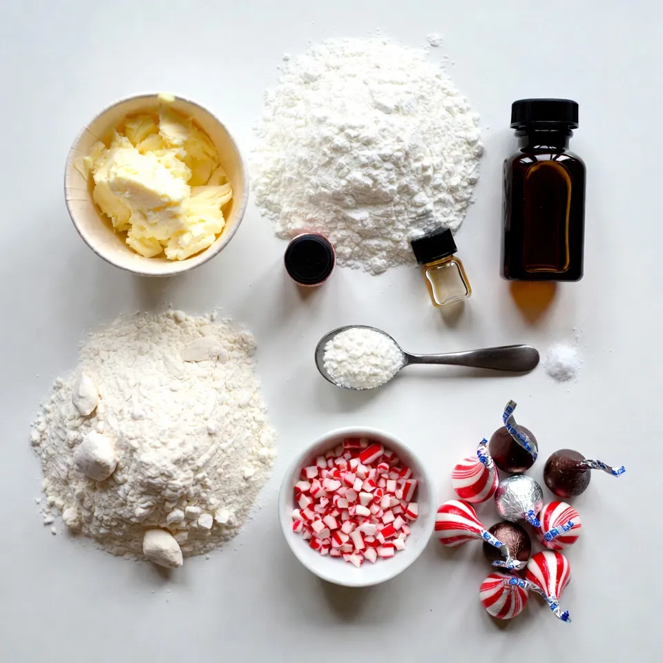The main ingredients form the base of our Candy Cane Kiss Cookies. Unsalted butter gives these cookies a rich flavor. Powdered sugar adds sweetness and a soft texture. Vanilla and almond extracts provide a warm, inviting aroma that makes the cookies irresistible.