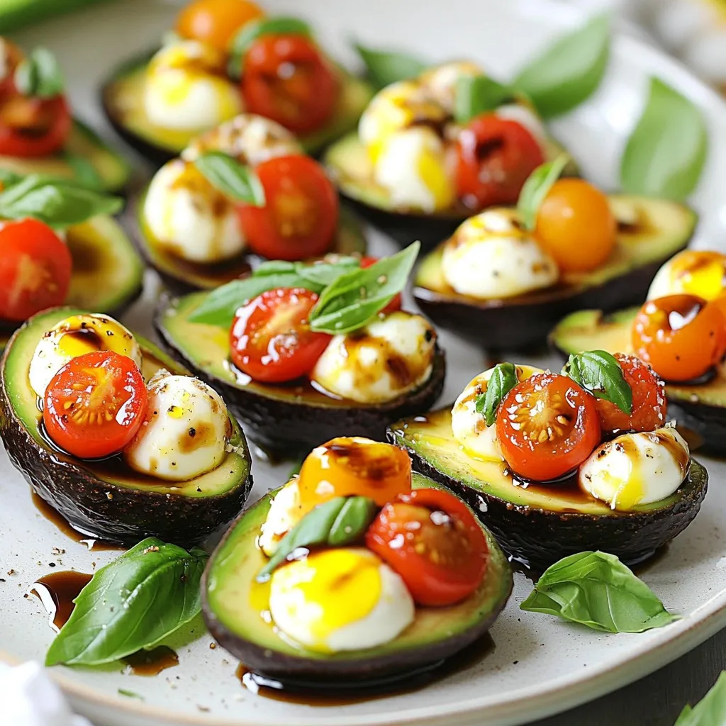A fresh and delicious dish featuring ripe avocados stuffed with cherry tomatoes, mozzarella, and basil, drizzled with balsamic glaze.