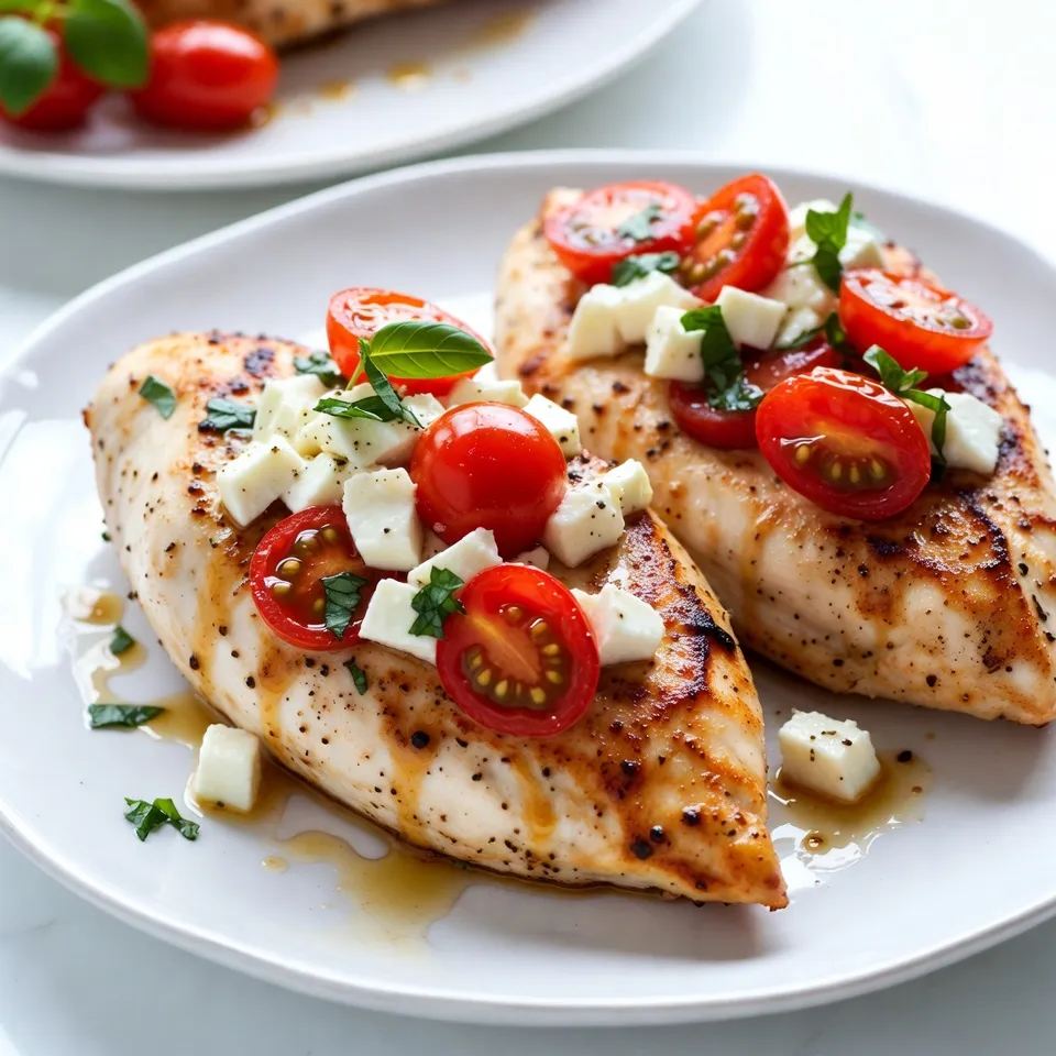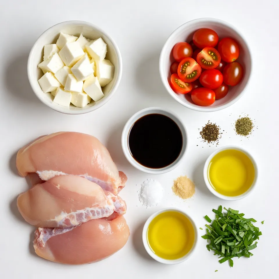 The chicken breasts should be large enough to hold the stuffing. Fresh mozzarella adds a creamy texture. Cherry tomatoes bring a sweet burst of flavor, while basil adds a refreshing note. Balsamic glaze enhances the dish with a tangy sweetness. The olive oil helps to sear the chicken, giving it a beautiful golden color.