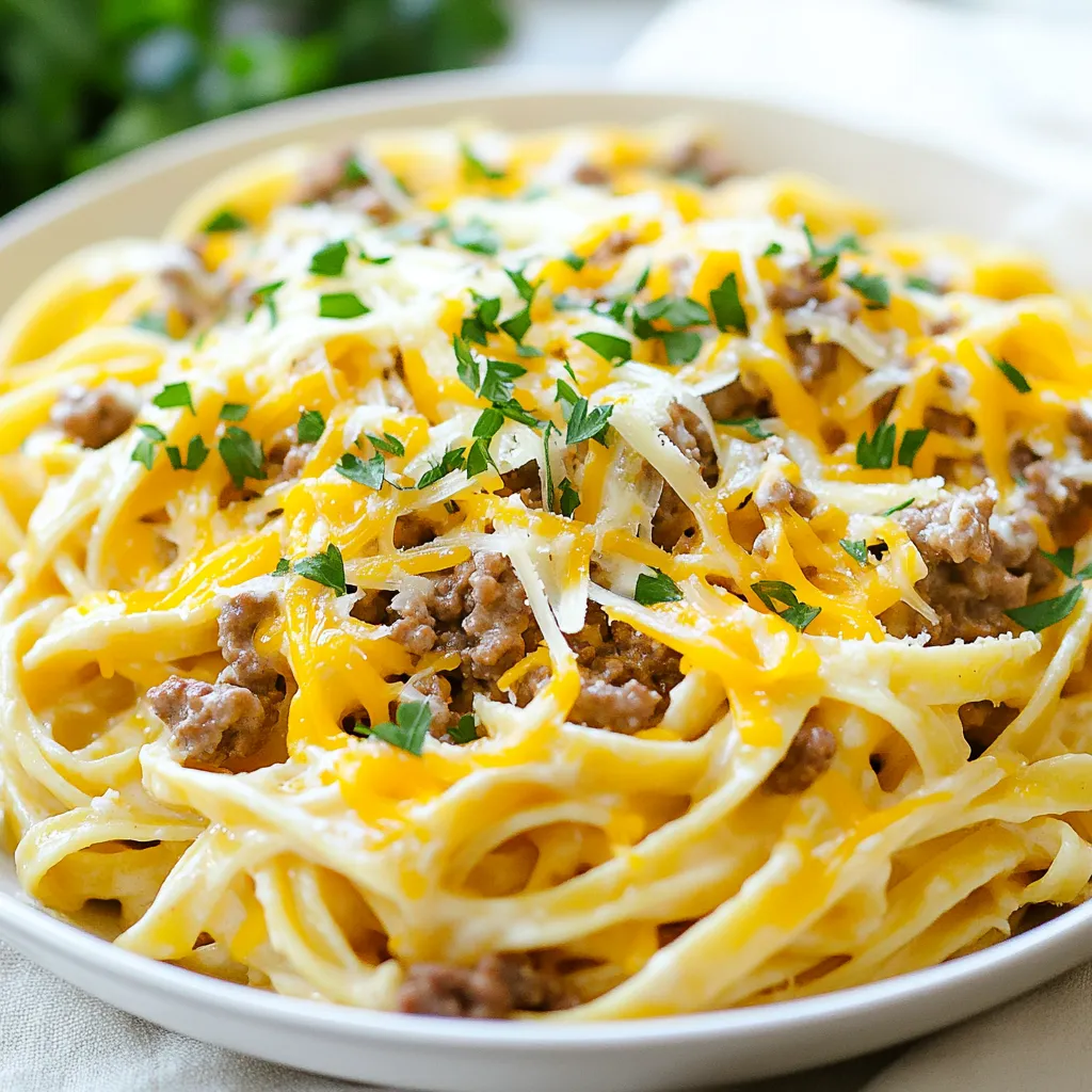 A creamy and cheesy pasta dish that combines the flavors of a cheeseburger with fettuccine pasta.