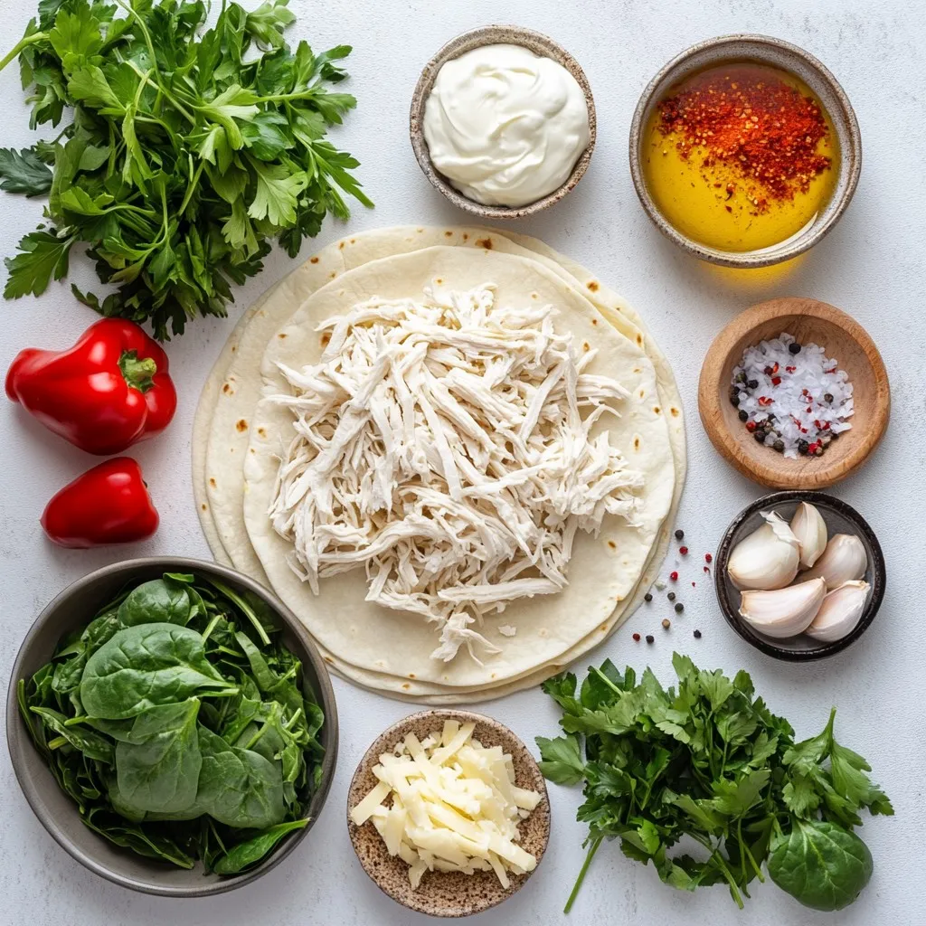 You want to start with cooked chicken. Shredded chicken works best here. You can use leftover chicken or rotisserie chicken for ease. Next, let’s talk about cheese. Mozzarella cheese adds a nice stretch. Cream cheese gives a creamy texture and rich taste. For the wraps, large flour tortillas are perfect. They hold everything well and are easy to fold.