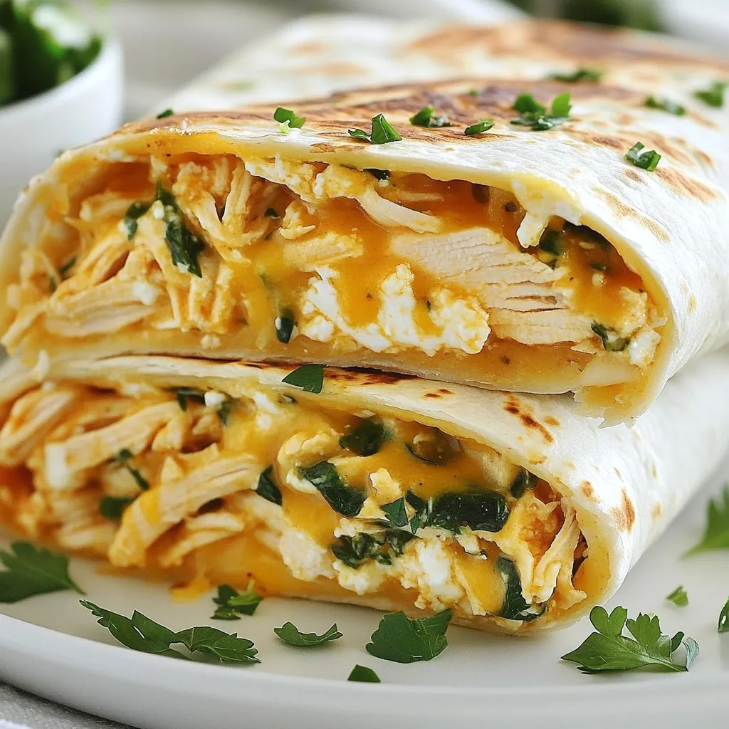 - 2 cups cooked chicken, shredded - 1 cup mozzarella cheese, shredded - ¼ cup cream cheese, softened - 4 large flour tortillas You want to start with cooked chicken. Shredded chicken works best here. You can use leftover chicken or rotisserie chicken for ease. Next, let’s talk about cheese. Mozzarella cheese adds a nice stretch. Cream cheese gives a creamy texture and rich taste. For the wraps, large flour tortillas are perfect. They hold everything well and are easy to fold. - 3 cloves garlic, minced - ½ cup spinach, chopped - ½ teaspoon garlic powder - ½ teaspoon paprika - Salt and pepper to taste - 2 tablespoons olive oil - Optional: fresh parsley for garnish Garlic is a star in this dish. Use three cloves for a strong garlic flavor. Minced garlic adds great taste, while garlic powder gives an extra kick. Paprika brings a bit of warmth. Don’t forget salt and pepper; they enhance all the flavors. Adding spinach or other greens gives freshness and color. Use olive oil to cook the wraps. For a finishing touch, sprinkle fresh parsley on top for a pop of green. {{ingredient_image_1}} Mixing the filling First, grab a large mixing bowl. Add 2 cups of shredded chicken. Toss in 1 cup of shredded mozzarella cheese and ¼ cup of softened cream cheese. Next, add 3 cloves of minced garlic, ½ cup of chopped spinach, ½ teaspoon of garlic powder, and ½ teaspoon of paprika. Sprinkle in salt and pepper to taste. Mix everything well. You want all the flavors to blend nicely. Heating the tortillas Now, heat 2 tablespoons of olive oil in a skillet over medium heat. Place one tortilla in the skillet and warm it for about 30 seconds. This makes it soft and easy to fold later. Folding and sealing the wraps Spoon a generous amount of the cheesy chicken mixture onto one half of the warmed tortilla. Carefully fold the tortilla over the filling. Press down lightly to seal it. This step keeps the filling inside while cooking. Cooking on both sides Cook the wrap for about 2-3 minutes until the bottom is golden and crispy. Flip the wrap carefully and cook for another 2-3 minutes. You want both sides to be golden brown and crunchy. Repeat this process for the remaining tortillas and filling. Slicing and serving suggestions Once cooked, remove the wraps from the skillet. Let them cool for a minute. Then slice each wrap in half. Serve them warm on a plate. If you like, garnish with fresh parsley for a pop of color. Enjoy your tasty cheesy garlic chicken wraps! To get a perfect golden wrap, use medium heat. If the heat is too high, the outside may burn before the inside warms. Use fresh ingredients for the best taste. Fresh garlic brings a strong flavor. Fresh spinach adds a nice crunch and color. Mix your filling well. This helps to spread the flavors evenly. When you cook the wraps, press down gently with a spatula. This helps seal the wrap and keeps the filling inside. These wraps taste great with a side salad. A simple mix of greens and tomatoes works well. For dips, try ranch or garlic sauce. These pair well with the cheesy flavor. You can also serve them with salsa. The fresh taste of salsa adds a nice twist. Don’t forget about garnishes! Fresh parsley not only looks nice but adds a fresh taste. Pro Tips Use Rotisserie Chicken: For a quicker preparation, use store-bought rotisserie chicken. It saves time and adds great flavor. Customize Your Fillings: Feel free to add other ingredients like bell peppers or mushrooms to the filling for extra texture and flavor. Perfectly Crispy Wraps: Ensure the skillet is hot enough before adding the wraps to achieve a golden, crispy exterior. Serve with Dips: Pair these wraps with your favorite dipping sauces, such as ranch or marinara, for an extra flavor boost. {{image_2}} You can switch out the chicken for other proteins. Try shredded turkey or even beef. Tofu works well too if you want a vegetarian option. Each protein brings its own taste and texture. You can also change the cheese. While mozzarella is classic, try cheddar or pepper jack for a kick. Cream cheese adds richness, but you can use ricotta or goat cheese instead. Mix and match to find your favorite flavor. If you need gluten-free options, use gluten-free tortillas. They are widely available and taste great. You won’t miss the regular ones at all. For vegan adaptations, use plant-based chicken or seitan. Replace all cheese with vegan cheese. Cream cheese can be swapped for cashew cream or hummus. This way, everyone can enjoy cheesy garlic chicken wraps! To keep your cheesy garlic chicken wraps fresh, follow these steps: - Refrigeration: Place leftover wraps in an airtight container. This keeps them from drying out. They stay good for about 3 days in the fridge. - Freezing Options: You can freeze these wraps for longer storage. Wrap each one tightly in plastic wrap, then place them in a freezer-safe bag. They last up to 3 months in the freezer. To enjoy your cheesy garlic chicken wraps again, reheating is key. Here are some methods: - Skillet Method: Heat a skillet over medium heat. Add the wrap and cook for 2-3 minutes on each side. This keeps them crispy. - Oven Method: Preheat your oven to 350°F (175°C). Place the wraps on a baking sheet and heat for about 10-15 minutes. This helps to warm them without making them soggy. Both methods help preserve the flavor and texture of your cheesy garlic chicken wraps. How do I ensure the wraps stay crispy? To keep your wraps crispy, cook them on medium heat. Use enough oil in the skillet. Make sure to fold the tortilla well. This seals the filling inside. Avoid overstuffing the wraps. Less filling means a better seal. Can I make these wraps ahead of time? Yes, you can prepare the filling ahead. Store it in the fridge for up to a day. When ready, fill and cook the tortillas. This way, you save time during busy days. What to do if the filling spills out? If the filling spills out while cooking, it’s usually too full. Gently press down on the wrap to seal it