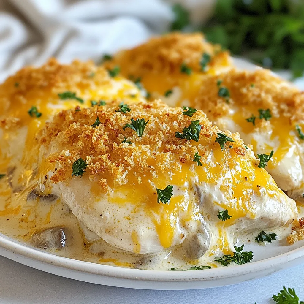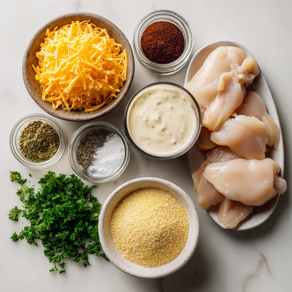 Start by gathering all your ingredients. You need four boneless, skinless chicken breasts. Grab a cup of sour cream and a cup of cream of mushroom soup. You will also need a cup of shredded cheddar cheese. Don’t forget the garlic powder, onion powder, paprika, salt, and pepper. If you want some crunch, get one cup of breadcrumbs. Lastly, chop some fresh parsley for a pretty touch.