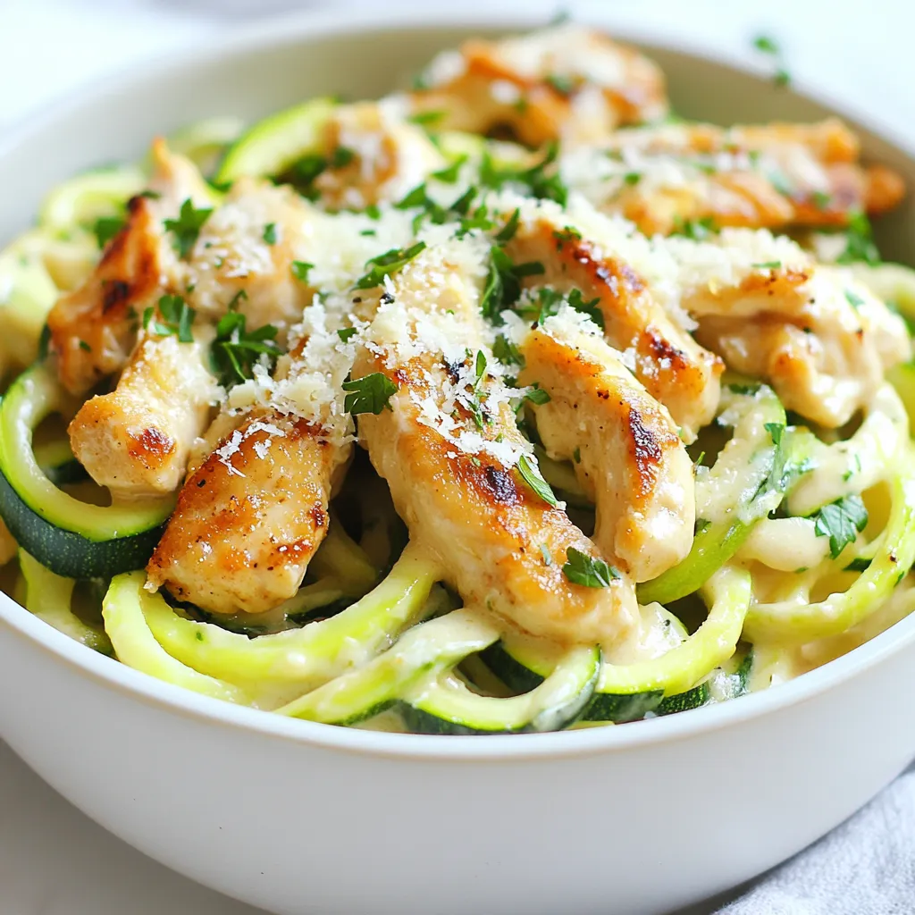 Garnishing makes your dish look fancy! Use fresh parsley for a pop of color. Chop it finely and sprinkle it over the top. Add extra grated Parmesan cheese for a cheesy finish. You can also drizzle a bit of the Alfredo sauce on top for a nice touch. Serve in a large, shallow bowl to show off those zoodles and chicken strips. This makes every plate look like a work of art!