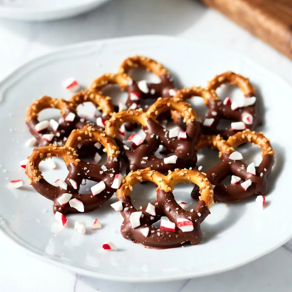 Delicious mini pretzels dipped in smooth chocolate and topped with crushed peppermint candies.