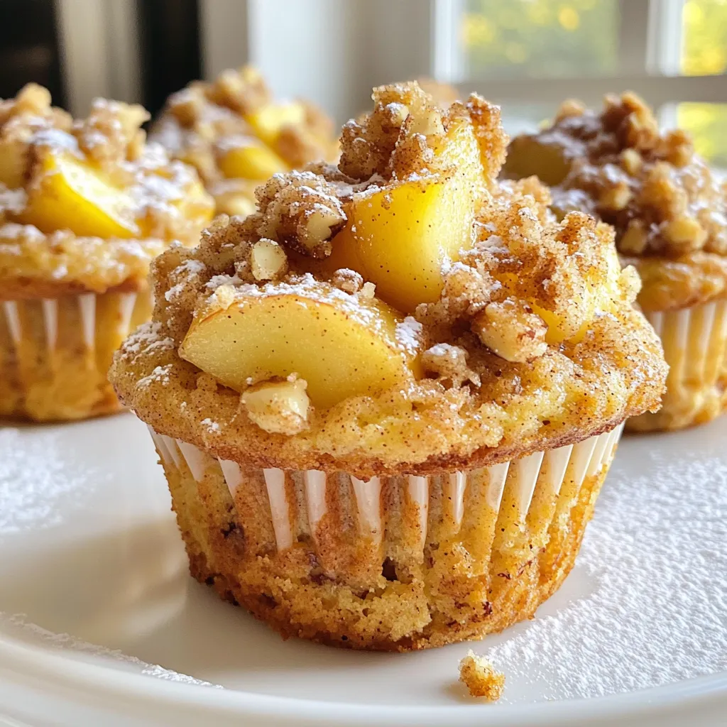 To make the muffins, gather these items: - 2 cups all-purpose flour - 1 cup sugar - 1 tablespoon baking powder - 1 teaspoon baking soda - 1 teaspoon ground cinnamon - 1/2 teaspoon salt - 1/2 cup unsalted butter, melted - 1 cup buttermilk (or milk with 1 tablespoon vinegar) - 2 large eggs - 2 cups apples, peeled and diced (about 2 medium apples) For the crumble topping, you will need: - 1/2 cup brown sugar - 1/3 cup all-purpose flour - 1 teaspoon ground cinnamon - 1/4 cup unsalted butter, softened If you want a crunch, add: - 1/2 cup walnuts or pecans, chopped (optional) These ingredients bring the perfect mix of flavors and textures. The apples give moisture, while the crumble adds a sweet crunch. Feel free to mix in your favorite nuts for extra flavor! {{ingredient_image_1}} First, set your oven to 375°F (190°C). This heat makes the muffins rise nicely. Line a muffin tin with paper liners or grease it lightly. This step helps the muffins come out easily after baking. In a large bowl, whisk together 2 cups of all-purpose flour, 1 cup of sugar, 1 tablespoon of baking powder, 1 teaspoon of baking soda, 1 teaspoon of ground cinnamon, and 1/2 teaspoon of salt. This blend forms a great base for your muffins. In another bowl, mix 1/2 cup of melted unsalted butter, 1 cup of buttermilk, and 2 large eggs. Stir until everything blends well. This mixture adds moisture and richness to the muffins. Slowly add the wet ingredients to the dry ones. Stir gently until just combined. Avoid over-mixing; this keeps the muffins light and fluffy. Next, fold in 2 cups of peeled and diced apples and 1/2 cup of chopped walnuts or pecans if you like. This step adds flavor and texture to each muffin, making them even more delicious. In a small bowl, mix 1/2 cup of brown sugar, 1/3 cup of all-purpose flour, 1 teaspoon of ground cinnamon, and 1/4 cup of softened butter. Use a fork to blend until the mixture is crumbly. This topping gives the muffins a sweet crunch. Spoon the muffin batter into the prepared muffin tin, filling each cup about 3/4 full. Then, sprinkle the crumble topping generously over each muffin. This extra layer adds a delightful crunch. Place the muffin tin in the oven and bake for 18-22 minutes. A toothpick should come out clean when inserted into the center. Allow the muffins to cool in the pan for about 5 minutes. Then, transfer them to a wire rack to cool completely. Enjoy the sweet aroma filling your kitchen! For great muffin texture, mix dry and wet ingredients separately. This helps avoid over-mixing. Over-mixing makes muffins tough. Stir just until you see no dry flour. Your batter should be lumpy, not smooth. Also, use room temperature eggs. They blend better, giving a soft texture. To keep your muffins moist, add apples while folding in the batter. Apples release moisture as they bake. Use buttermilk or milk with vinegar for a richer taste. Avoid baking too long. Check for doneness a few minutes early. A toothpick should come out clean, not wet. Serve your muffins warm for the best taste. Dust with powdered sugar for a nice look. Pair them with whipped cream for a treat. A scoop of vanilla ice cream adds extra joy. Enjoy them with a cup of coffee or tea for a cozy snack. Pro Tips Use Fresh Apples: For the best flavor and texture, opt for fresh, tart apples like Granny Smith that hold their shape during baking. Don’t Overmix: Mix the wet and dry ingredients until just combined to keep the muffins light and fluffy; overmixing can lead to dense muffins. Customize Your Nuts: Feel free to swap walnuts or pecans with your favorite nuts or leave them out entirely for a nut-free version. Storage Tips: Keep leftover muffins in an airtight container at room temperature for up to 3 days, or freeze for longer storage. {{image_2}} You can switch up the apples for other fruits. Pears work great in this recipe. They add a sweet taste and soft texture. Berries like blueberries or raspberries also make a fun twist. They add bursts of flavor and color. You can even use peaches or plums for a summer treat. Just make sure to adjust the sugar based on the fruit's sweetness. If you need a gluten-free option, use gluten-free flour blends. These blends often work well in muffins. You can find them at most grocery stores. Look for ones that include xanthan gum for better texture. You may need to add a bit more liquid. Check the package for any specific adjustments. To make these muffins vegan, replace the eggs with flax eggs. Mix 1 tablespoon of flaxseed meal with 2.5 tablespoons of water for each egg. Let it sit for a few minutes until it thickens. Use plant-based milk instead of buttermilk. Almond or soy milk works nicely. Swap unsalted butter for coconut oil or vegan butter. These changes keep the muffins delicious and fluffy. To keep your muffins fresh, let them cool completely. Then, place them in an airtight container. You can store them at room temperature for up to three days. If you want to keep them longer, consider refrigerating them. Just remember, muffins can dry out quickly in the fridge. If you have extra muffins, freezing is a great option. Wrap each muffin tightly in plastic wrap. Then, place the wrapped muffins in a freezer bag. They will stay fresh for up to three months. When you're ready to enjoy them, just take one out and let it thaw at room temperature. To reheat, you have a few choices. You can use a microwave for quick warming. Heat each muffin for about 15-20 seconds. If you prefer a crispy top, use the oven. Preheat it to 350°F (175°C), then warm the muffins for about 5-10 minutes. Enjoy them warm for the best taste! To make these muffins, start by mixing dry and wet ingredients separately. In a bowl, combine 2 cups of flour, 1 cup of sugar, 1 tablespoon of baking powder, 1 teaspoon of baking soda, 1 teaspoon of ground cinnamon, and 1/2 teaspoon of salt. In another bowl, mix 1/2 cup of melted butter, 1 cup of buttermilk, and 2 large eggs. Add the wet mix to the dry mix and stir g