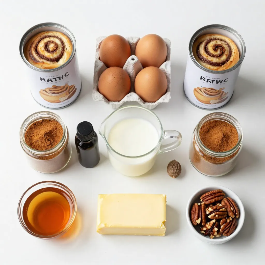To make this bake, start with the main ingredients. The cinnamon rolls bring that sweet, warm flavor. Eggs and milk form a rich custard. Vanilla, cinnamon, and nutmeg add depth to every bite.