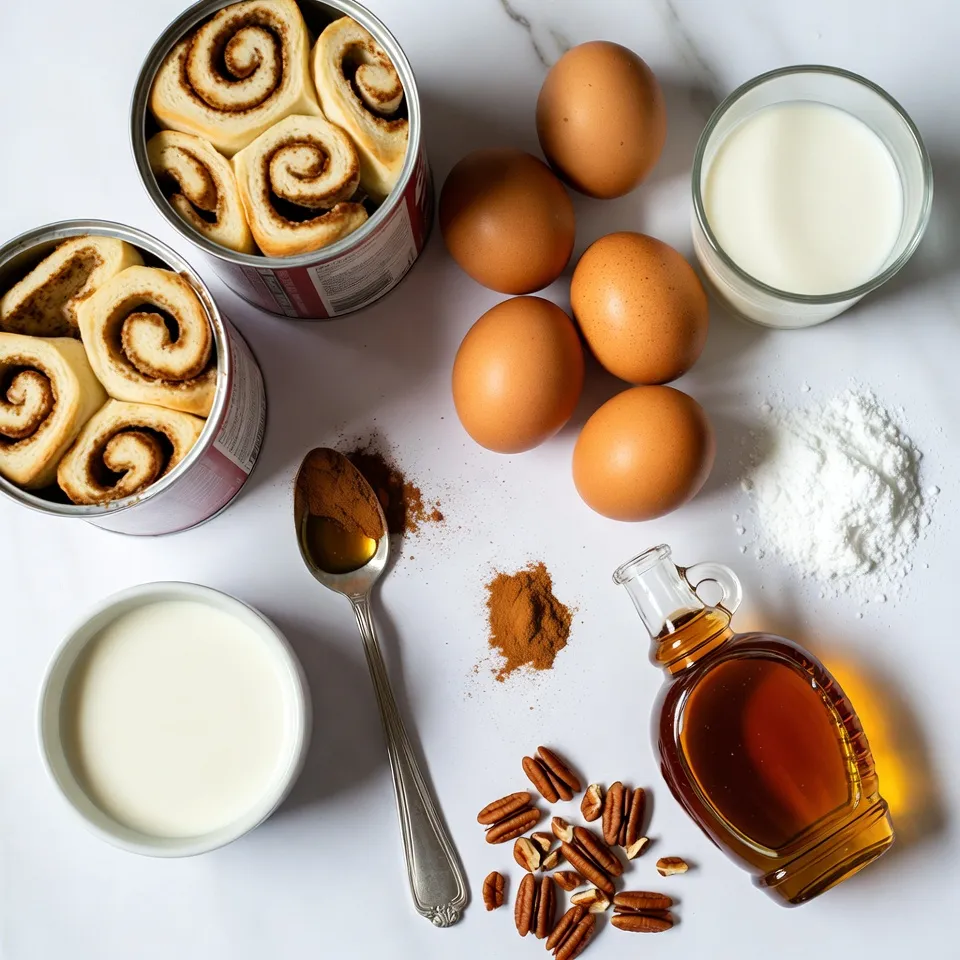 To make Cinnamon Roll French Toast Bake, you need simple ingredients. You start with two cans of refrigerated cinnamon rolls. They bring the sweet, fluffy texture to the dish. Next, grab six large eggs for the egg mixture. Eggs give the bake its rich flavor and hold everything together.
