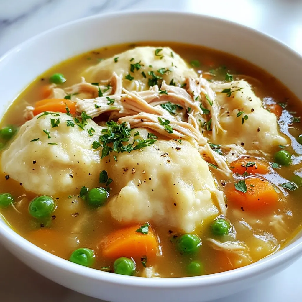 - 2 tablespoons olive oil - 1 medium onion, diced - 2 cloves garlic, minced - 3 medium carrots, sliced - 3 celery stalks, sliced - 1 teaspoon dried thyme - 1 teaspoon dried rosemary - 6 cups chicken broth - 2 cups cooked chicken, shredded - 1 cup frozen peas - Salt and pepper to taste - 2 cups all-purpose flour - 1 tablespoon baking powder - 1 teaspoon salt - 3 tablespoons unsalted butter, melted - 1 cup milk - Chopped fresh parsley - Crusty bread for serving When making Classic Chicken & Dumplings, gather all your ingredients first. This helps you stay organized. Start with the main ingredients for the soup. The olive oil adds flavor and helps cook the veggies. The onion and garlic create a nice base. Next, the carrots and celery add crunch and sweetness. Don’t forget the dried thyme and rosemary. They give the dish a warm, earthy taste. The chicken broth is the heart of the soup. It brings everything together. Use cooked chicken to save time; rotisserie chicken works great here. The frozen peas add color and pop to your meal. Now, let’s talk about dumplings. For these, you need flour, baking powder, and salt. The butter makes them rich and tasty. Milk gives them a soft texture. Finally, garnish with fresh parsley for color. Serve with crusty bread for a complete meal. This dish is all about comfort, and these ingredients create just that. {{ingredient_image_1}} - Heat 2 tablespoons of olive oil in a large pot over medium heat. - Add 1 medium diced onion and 2 minced garlic cloves. Sauté for about 5 minutes. The onion should be soft and clear. - Next, add 3 sliced carrots and 3 sliced celery stalks. Cook for about 5 to 7 minutes until they are soft. - Stir in 1 teaspoon of dried thyme and 1 teaspoon of dried rosemary. This adds great flavor. - Pour in 6 cups of chicken broth and bring the mix to a gentle boil. - In a medium bowl, combine 2 cups of all-purpose flour, 1 tablespoon of baking powder, and 1 teaspoon of salt. - Mix in 3 tablespoons of melted butter and 1 cup of milk. Stir until just combined. Don’t overmix. - Drop spoonfuls of the dumpling batter onto the simmering broth. You should have about 10 to 12 dumplings. - Cover the pot with a lid and cook the dumplings for 15 to 20 minutes. Do not lift the lid during cooking. - Once cooked, gently stir the chicken and broth to combine. Season with salt and pepper to taste. Adjust if needed. Using rotisserie chicken saves time and adds flavor. It is already cooked and seasoned well. You can quickly shred it for your dish. To shred cooked chicken easily, use two forks. Hold one fork steady and pull the chicken apart with the other. This method works best when the chicken is warm. To make fluffy dumplings, avoid overmixing the batter. Stir just until the ingredients come together. Overmixing can make the dumplings tough. To check for fluffiness, look for a light and airy texture. The batter should hold its shape but not be too thick. Spices and herbs can boost the taste of your dish. I recommend using dried thyme and rosemary for a classic flavor. You can also add a pinch of garlic powder or onion powder for extra depth. When choosing broth, homemade is best for flavor. However, store-bought broth is a great option when you're short on time. Just look for low sodium versions to control salt levels. Pro Tips Use Rotisserie Chicken: For a quick and easy option, rotisserie chicken adds great flavor and saves cooking time. Don't Overmix the Dumplings: When combining the dumpling ingredients, mix just until combined to ensure fluffy dumplings. Season to Taste: Adjust the salt and pepper at the end of cooking for the best flavor balance in your dish. Let Dumplings Steam: Keep the lid on while the dumplings cook to trap steam, ensuring they cook through properly. {{image_2}} You can make this dish healthier by switching to whole wheat flour for the dumplings. Whole wheat flour adds fiber and nutrients, making your meal more filling. You can also add extra vegetables like zucchini, spinach, or bell peppers. These veggies boost nutrition without much effort. To change the flavor, try adding different herbs and spices. Fresh parsley, dill, or even basil can brighten the dish. You can also add a splash of hot sauce or Worcestershire sauce for a kick. These additions can make your chicken and dumplings more exciting and flavorful. If you need a gluten-free option, use gluten-free flour for the dumplings. Many brands offer good substitutes. For dairy-free variations, try almond milk or coconut milk in the dumpling mix. These changes keep the dish tasty while fitting different diets. To keep your chicken and dumplings fresh, store them in an airtight container. Place the container in the fridge. Make sure to use the leftovers within three days. If you want to save them longer, freezing is a great option. Portion them into freezer-safe bags. Remove as much air as you can before sealing. This keeps the flavors intact. For stovetop reheating, place the chicken and dumplings in a pot. Add a splash of chicken broth or water. Heat over low to medium heat, stirring gently. This helps to warm them evenly without drying out. If you prefer the microwave, use a microwave-safe bowl. Cover it with a damp paper towel to maintain moisture. Heat in short intervals, stirring in between. You can store chicken and dumplings in the fridge for up to three days. If frozen, they last about three months. Check for signs of spoilage before eating. Look for off smells, odd colors, or mold. If you see any of these, it's best to toss the dish. You can use vegetable broth, beef broth, or water with seasoning. Each option adds a unique taste. If you have homemade stock, that’s even better! Yes, you can prepare the dumpling dough ahead of time. Store it in the fridge for up to 24 hours. Just remember to drop them into the simmering broth when ready to cook. Dumplings are done when they double in size and feel fluffy. You can also cut one open to check. If it’s cooked t