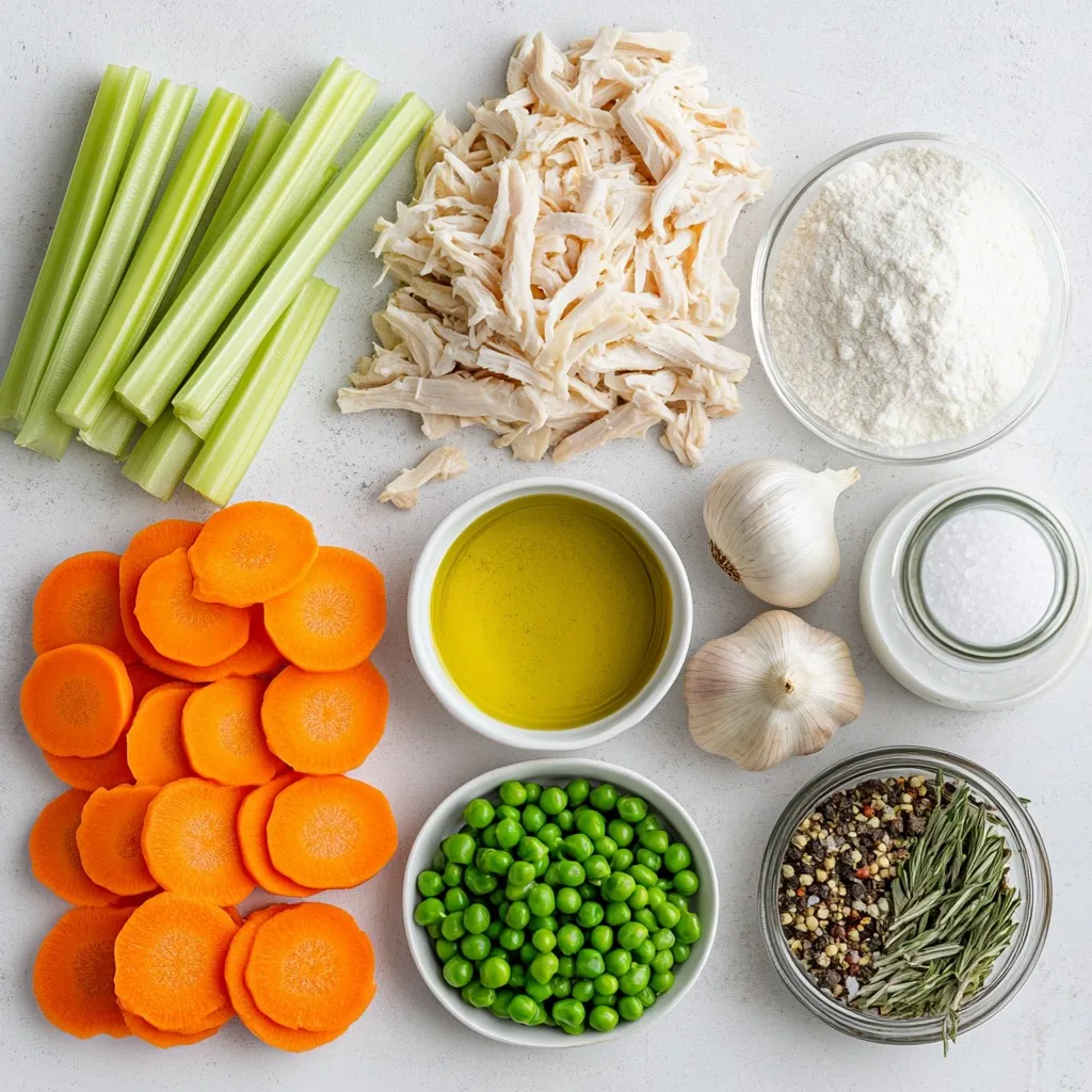 Don’t forget the dried thyme and rosemary. They give the dish a warm, earthy taste. The chicken broth is the heart of the soup. It brings everything together. Use cooked chicken to save time; rotisserie chicken works great here. The frozen peas add color and pop to your meal.