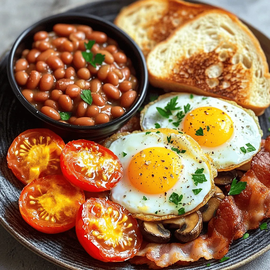 Presentation can make your breakfast look even more inviting. Use a warm plate to serve your meal. Arrange the sausages, bacon, and mushrooms neatly. Place the halved tomato with the cut side facing up. This shows off its bright color. Serve the baked beans in a small bowl on the side. Finally, add the eggs on top. A sprinkle of fresh parsley adds a nice touch. This not only enhances the look but adds a burst of freshness.
