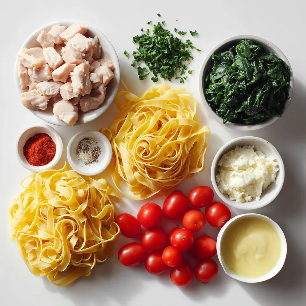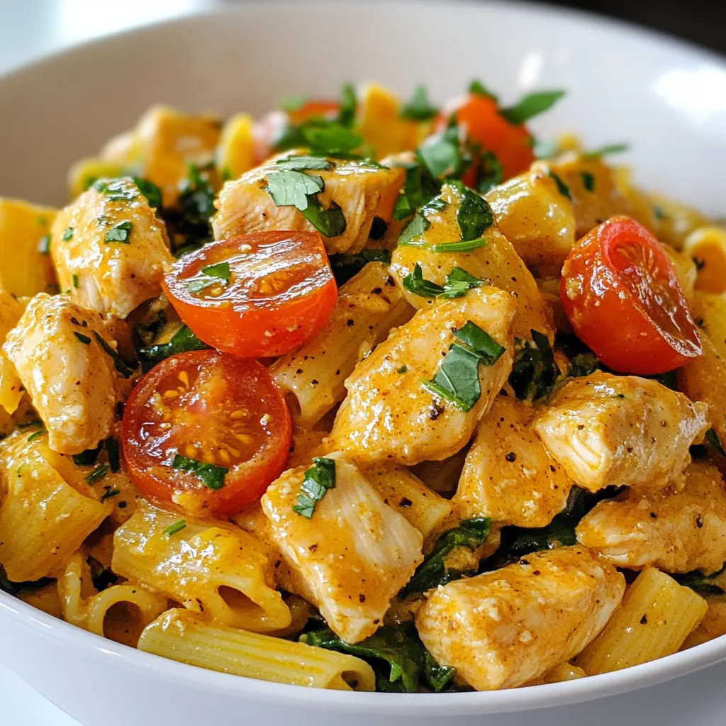 A delicious pasta dish featuring chicken in a buttery garlic sauce with spices, tomatoes, and spinach.