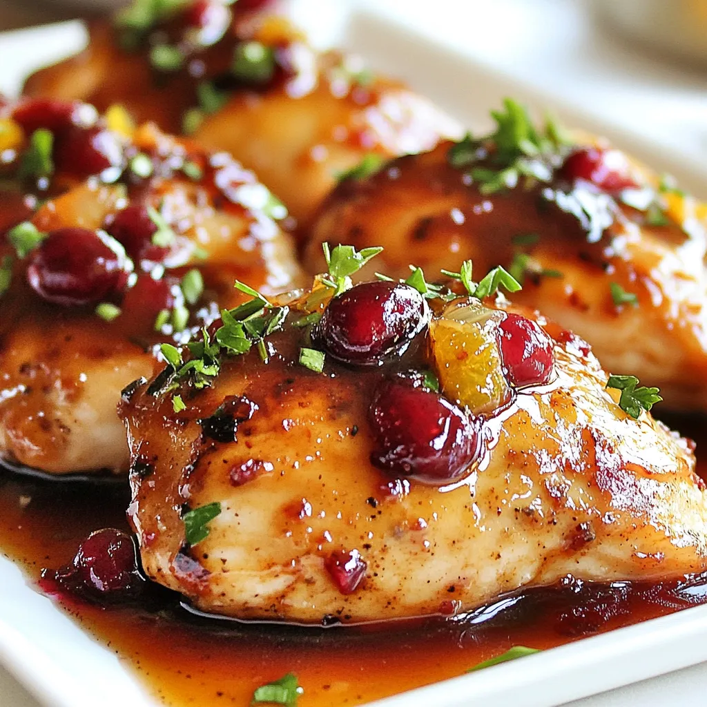 - 4 boneless, skinless chicken breasts - 1 cup fresh or frozen cranberries - 1/2 cup honey - 1/4 cup orange juice - 2 tablespoons soy sauce - 1 tablespoon Dijon mustard - 1 teaspoon garlic powder - 1 teaspoon dried thyme - Salt and pepper to taste - 2 tablespoons olive oil - Fresh parsley, chopped for garnish Cranberry glazed chicken is a dish full of flavor and color. The main star is the chicken. Use boneless, skinless chicken breasts for a quick cook and easy eating. Cranberries add a sweet and tart taste. You can use fresh or frozen cranberries. Both work well. Honey plays a big role in the glaze. It brings sweetness and helps the glaze stick to the chicken. Add a splash of orange juice for bright flavor. Soy sauce gives depth and a hint of saltiness. Dijon mustard adds a touch of heat and complexity. Garlic powder and dried thyme enhance the dish, giving it warmth and earthiness. You’ll need salt and pepper to season the chicken. Olive oil helps to sear the chicken, giving it a nice crust. Finally, fresh parsley adds a pop of green and freshness when you serve the dish. These ingredients come together to make a simple yet delicious meal. Each bite is a mix of sweet, tangy, and savory flavors. {{ingredient_image_1}} 1. Preheating the oven: Start by preheating your oven to 400°F (200°C). This step gets the oven ready for the chicken. 2. Cooking the cranberry glaze: In a medium saucepan, mix together cranberries, honey, orange juice, soy sauce, Dijon mustard, garlic powder, and thyme. Heat on medium until the cranberries burst and the sauce thickens, about 10-12 minutes. 3. Searing the chicken breasts: While the glaze cooks, take four boneless, skinless chicken breasts. Season them with salt and pepper on both sides. In a large oven-safe skillet, heat two tablespoons of olive oil over medium-high heat. Add the chicken and sear for about five minutes on each side until golden brown. 4. Baking the chicken with glaze: Once the chicken is seared, pour the thick cranberry glaze over it. Make sure each piece is coated. Place the skillet in the preheated oven and bake for 20-25 minutes. The chicken is done when it reaches an internal temperature of 165°F (75°C). - Tips for properly searing chicken: Make sure the skillet is hot before adding the chicken. This helps create a nice golden crust. Avoid moving the chicken too much while it cooks for the best sear. - How to make the glaze thick and flavorful: Stir the glaze often while it cooks. This helps the cranberries break down and mix with the other flavors. If it is too thin, let it simmer a bit longer. - Resting period for the chicken: After baking, take the chicken out and let it rest for a few minutes. This helps keep it juicy. - Spoon extra glaze before serving: Before serving, drizzle some extra glaze over the chicken. This adds extra flavor and looks great on the plate. - Garnishing techniques: Chop fresh parsley and sprinkle it on top. This adds a pop of color and a fresh taste. Serve your cranberry glazed chicken on a rustic board or a white platter to highlight the dish. To make sure your chicken is cooked well, check its internal temperature. It should reach 165°F (75°C). Use a meat thermometer to be accurate. This step keeps it safe to eat and juicy. You can adjust the glaze to fit your taste. Want it sweeter? Add more honey. Prefer a tangy flavor? Increase the orange juice. This dish is flexible, so feel free to experiment. For side dishes, steamed green beans work great. A light salad also pairs nicely. These sides add color and texture to your plate. When plating, use a rustic wooden board or a white platter. This helps the vibrant cranberry sauce stand out. Garnish with fresh parsley for an extra touch of color. You will need a medium saucepan for the glaze. A large oven-safe skillet helps with searing and baking the chicken. Keep a meat thermometer handy. It helps ensure your chicken is cooked just right. A spatula makes it easy to handle the chicken while cooking and serving. Pro Tips Tip Title: Fresh Cranberries for Brightness: Using fresh cranberries instead of frozen will give your glaze a brighter flavor and a more vibrant color. Tip Title: Sear for Flavor: Don’t skip the searing step! It adds a delicious crust to the chicken and enhances the overall flavor. Tip Title: Resting Time: Allow the chicken to rest for a few minutes after baking. This helps the juices redistribute, keeping the meat tender and juicy. Tip Title: Customize Your Glaze: Feel free to experiment with additional spices, such as cinnamon or ginger, to give the cranberry glaze a unique twist. {{image_2}} You can change the glaze’s sweetness using different sweeteners. Maple syrup or agave nectar works great. Each brings its unique taste to the dish. You can also add spices or herbs to change the flavor. Try adding a pinch of cayenne pepper for heat or rosemary for a woodsy flavor. These small changes can make a big difference. If you prefer, you can swap chicken for turkey. Turkey breast works well with this glaze and is just as tasty. For a vegetarian option, try tofu. Just make sure to press the tofu to remove excess water. Cooking times will change with different proteins. Turkey may need a bit longer, while tofu takes less time. You can get creative with how you serve this dish. Try making wraps or sandwiches. Use the glazed chicken as a filling with fresh greens and your favorite sauce. You can also add more vegetables to the dish. Stir in steamed broccoli or roasted bell peppers for color and extra nutrition. These variations keep the meal fun and fresh! After you enjoy your cranberry glazed chicken, store any leftovers in an airtight container. This helps keep the chicken moist and fresh. Place the container in the fridge. You can safely store it for up to three days. If you're unsure, check the smell and color before eating. Always label the container with the date so you know when you made it. To freeze cranberry glazed chicken, first