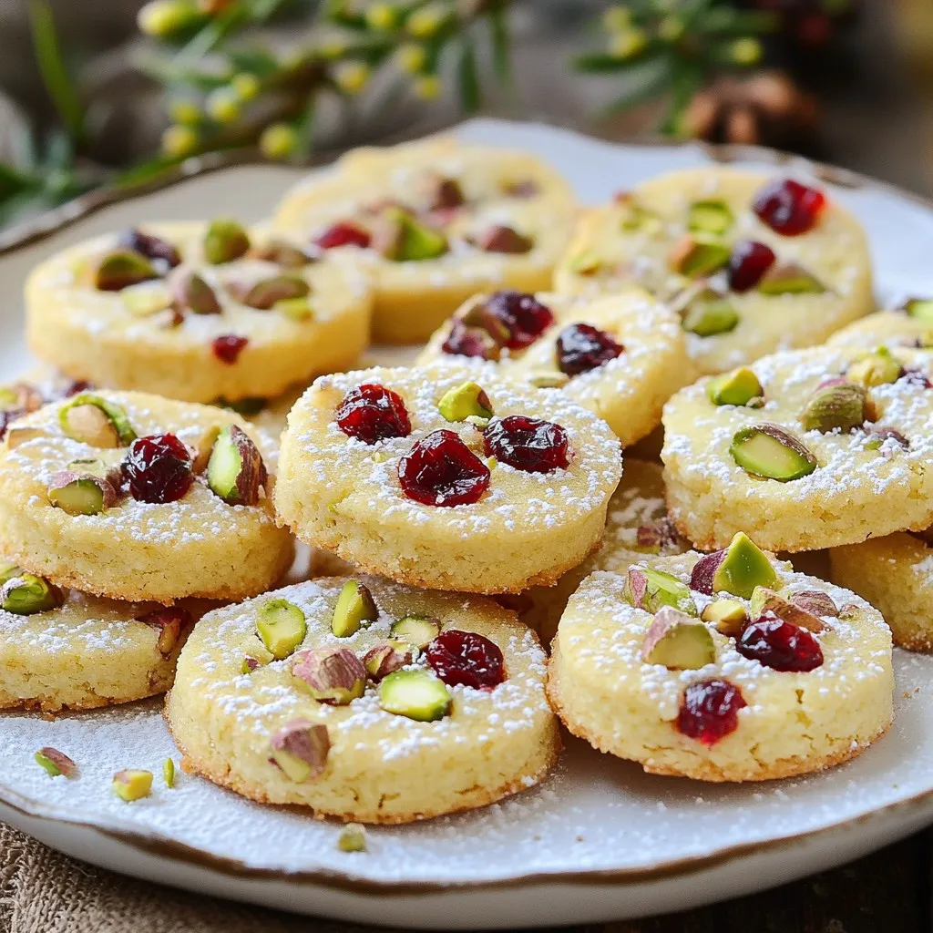 Deliciously buttery shortbread cookies with a festive twist of cranberries and pistachios.