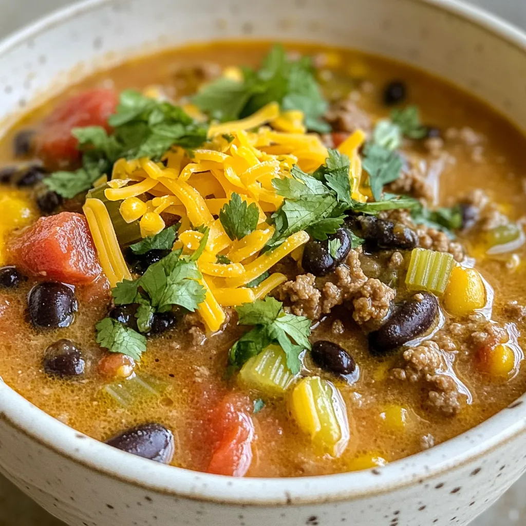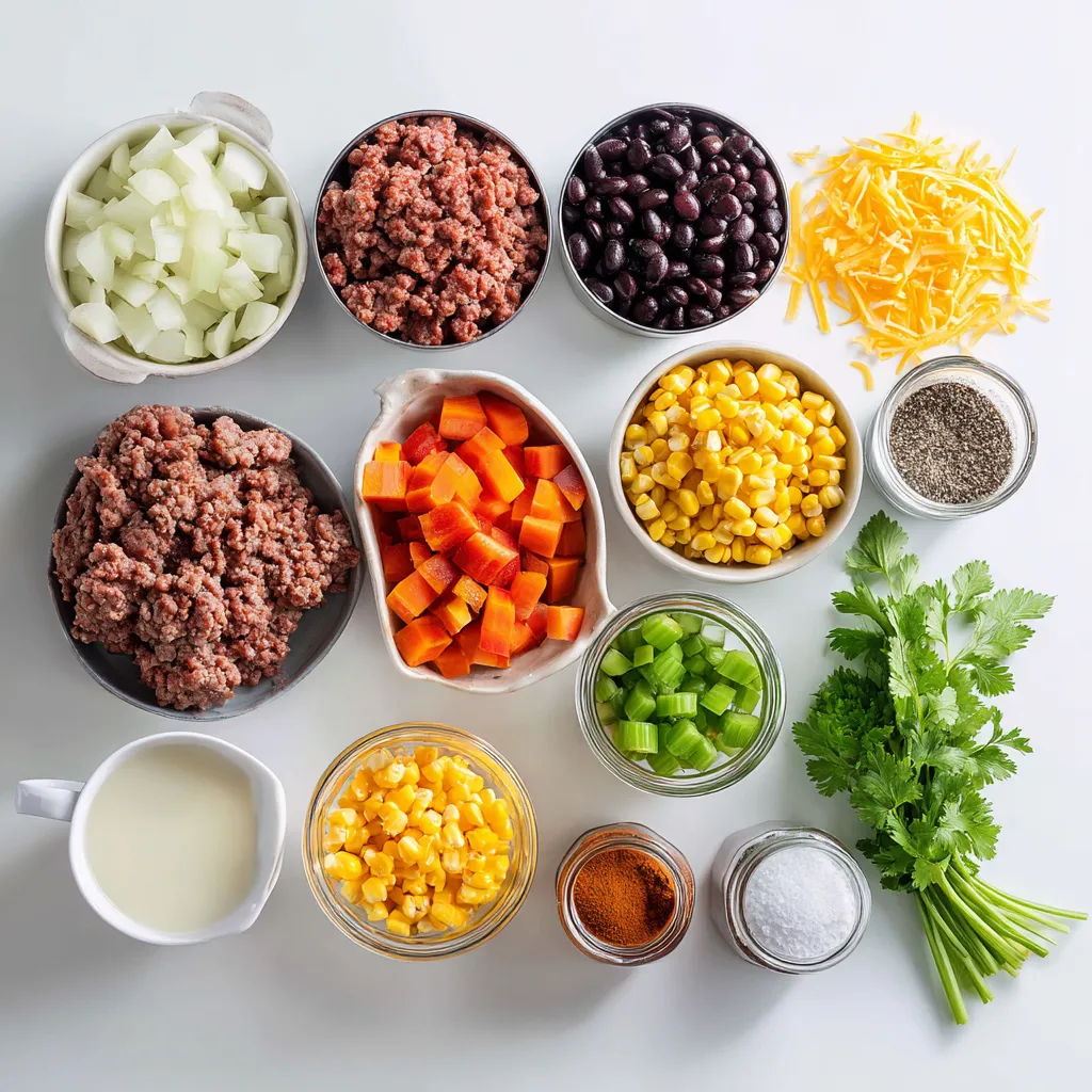 The main ingredients create the base of the soup. Ground beef brings rich flavor. The diced onion adds sweetness. Garlic gives a nice aroma. Carrots and celery bring crunch and color. Canned black beans and corn provide texture. Diced tomatoes with green chilies add heat and tang. Beef broth gives depth and body. Heavy cream makes it creamy and smooth.