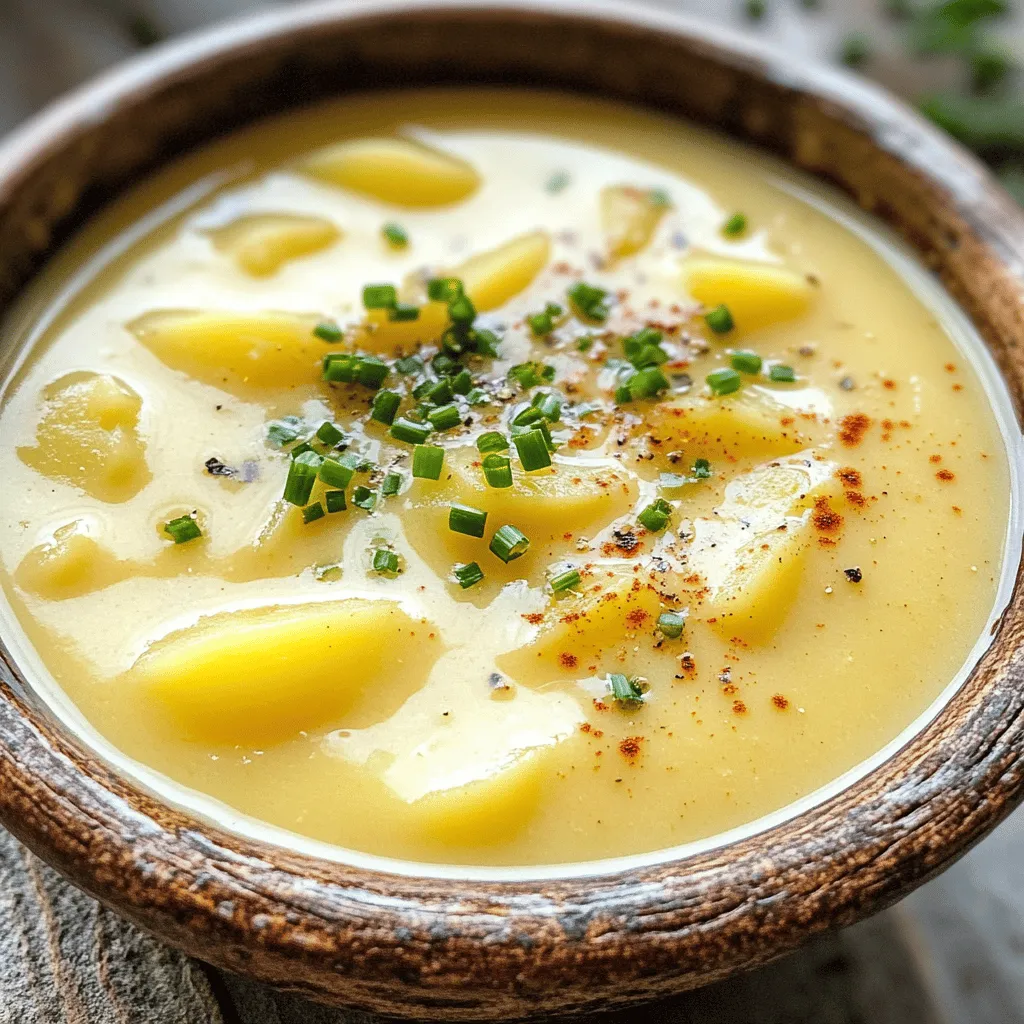 To make this creamy potato soup, gather these ingredients: - 4 large Yukon Gold potatoes, peeled and diced - 1 medium onion, chopped - 2 cloves garlic, minced - 4 cups vegetable broth - 1 cup heavy cream (or coconut cream for a dairy-free option) - 1 teaspoon dried thyme - 1 teaspoon paprika - Salt and pepper to taste - 2 tablespoons olive oil - Fresh chives or parsley for garnish You can easily swap some ingredients for a different taste or diet. Here are a few ideas: - Dairy-free: Use coconut cream instead of heavy cream. - Broth: Swap vegetable broth for chicken broth if you prefer. - Potatoes: If Yukon Gold is not available, russet potatoes work too. - Herbs: You can replace dried thyme with fresh thyme or rosemary for a fresh twist. Choosing the right potatoes makes a difference in flavor and texture. Here’s how to pick good ones: - Look for firm potatoes without any soft spots or blemishes. - Choose potatoes that are uniform in size for even cooking. - Avoid potatoes with green skin, as this can be toxic. - If possible, pick organic potatoes for better taste and fewer chemicals. Gather all your ingredients first. You need four large Yukon Gold potatoes, one medium onion, and two cloves of garlic. Also, have your vegetable broth, heavy cream, thyme, paprika, olive oil, salt, and pepper ready. This will make cooking easy. Start by heating two tablespoons of olive oil in a large pot over medium heat. Add the chopped onion and sauté for about four to five minutes until it looks clear. Then, add the minced garlic and sauté for another minute. This step builds a great base flavor. Next, mix in the diced potatoes, dried thyme, and paprika. Cook this mixture for two to three minutes. This helps the potatoes soak in the spices. Now, pour in four cups of vegetable broth. Bring this to a boil, then reduce the heat. Let it simmer for about 15 to 20 minutes. You want the potatoes to be soft. After the potatoes are tender, it's time to blend. Use an immersion blender to mix the soup until it is smooth and creamy. If you do not have one, carefully transfer the soup to a standard blender. Blend in small batches to avoid spills. Once blended, return the soup to the pot if you used a blender. Stir in one cup of heavy cream, letting it warm over low heat for about five minutes. Season with salt and pepper. Your creamy potato soup is now ready to serve! To get that perfect creamy texture, blend the soup well. An immersion blender works best. If you use a standard blender, do it in small batches. Be careful with hot soup! Blend until it is smooth and no lumps remain. This step is key for a rich and velvety feel. Serve this soup hot. The warm soup brings out all the flavors. Heat it gently over low heat before serving. If it cools too much, it can lose its creamy goodness. A temperature of about 160°F is ideal for serving. One common mistake is not cooking the potatoes enough. Make sure the potatoes are very tender before blending. Another mistake is adding too much cream too early. Add the cream after blending for the best texture. Lastly, remember to season well. A little salt and pepper can make a big difference! {{image_2}} To make your creamy potato soup pop, try adding spices and herbs. A sprinkle of garlic powder can boost flavor. Fresh herbs like rosemary or thyme add a nice touch. You can also use smoked paprika for a smoky taste. Try adding a pinch of cayenne pepper if you like some heat. These small changes can make a big difference in taste! You can add more veggies to the soup for extra flavor. Carrots or celery work well with potatoes. If you want protein, consider adding cooked bacon or diced ham. You can also mix in some sautéed mushrooms for an earthy flavor. These ingredients can make the soup heartier and more filling. Serving your soup can be fun! Try topping the soup with crispy bacon bits or shredded cheese. You can also add a dollop of sour cream for creaminess. Fresh herbs like chives or parsley look great on top too. For a crunchy twist, serve with homemade croutons or garlic bread on the side. These ideas can make your meal feel special! You can keep your creamy potato soup in the fridge. Use an airtight container. This keeps the soup fresh. It lasts about 3 to 4 days. Before storing, let the soup cool down first. This helps avoid extra moisture. To freeze, let the soup cool completely. Then, pour it into freezer-safe bags or containers. Leave some space at the top. The soup expands when frozen. It stays good for up to 3 months. When ready to eat, move it to the fridge to thaw overnight. Reheat the soup slowly on the stove. Use low to medium heat. Stir often to keep it smooth. If the soup is too thick, add a bit of broth or water. You can also microwave it. Use a microwave-safe bowl and cover it loosely. Heat in short bursts, stirring in between. Enjoy your warm and creamy soup! Yes, you can make this soup ahead. Cook the soup, then let it cool. Store it in the fridge for up to three days. When ready to eat, heat it gently on the stove. This soup tastes even better the next day! The flavors blend well when it sits. This creamy potato soup is naturally gluten-free. Use vegetable broth that is gluten-free. Check the label on your broth to be sure. If you add any toppings, use gluten-free options like fresh herbs or nuts. This way, everyone can enjoy the soup. To spice up your creamy potato soup, add a pinch of cayenne pepper. You can also use crushed red pepper flakes for a different heat. Another option is to add diced jalapeños when cooking the onions. The heat level is up to you! Adjust it to suit your taste. You learned about the key ingredients for creamy potato soup and how to select the best ones. We discussed step-by-step preparation, cooking methods, and blending for a smooth texture. I shared tips for serving, avoiding common mistakes, and creative variations to boost flavor. Lastly, we covered proper storage and answered FAQs. Remember, making this soup can be s