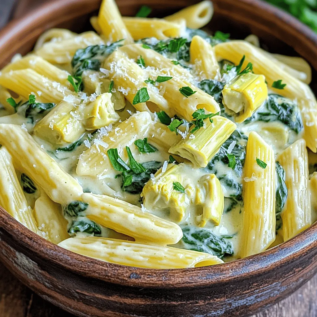 Start by gathering all your ingredients. You will need 12 ounces of penne pasta, 1 can of artichoke hearts, and 3 cups of fresh spinach. Also, get 1 cup of softened cream cheese, 1 cup of grated Parmesan cheese, and 2 cups of vegetable broth. Don’t forget 1 cup of milk, 2 cloves of minced garlic, and your spices: onion powder, garlic powder, and Italian seasoning. Finally, have salt and pepper ready to taste.