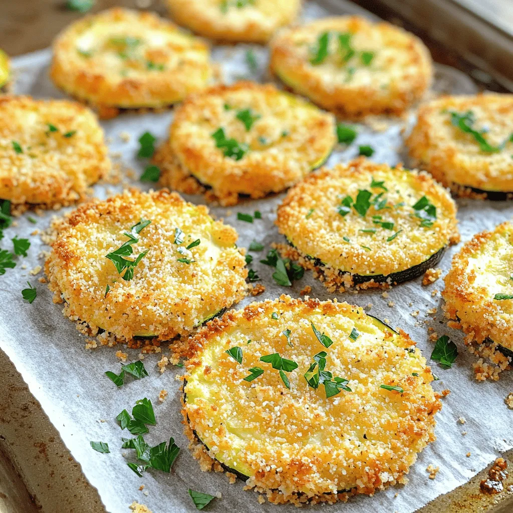 - 2 large zucchinis - 1 cup breadcrumbs - 1/2 cup grated Parmesan cheese - 1 teaspoon garlic powder - 1 teaspoon onion powder - 1 teaspoon Italian seasoning - 1/2 teaspoon salt - 1/4 teaspoon black pepper - 2 eggs, beaten - 2 tablespoons olive oil - Optional garnish: fresh parsley To make crispy baked Parmesan zucchini, gather these fresh ingredients first. You need two large zucchinis. These squash are key for a tasty treat. They should be firm and vibrant in color. Next, you’ll need one cup of breadcrumbs. Panko breadcrumbs work best for extra crunch. Then, grab half a cup of grated Parmesan cheese. This cheese adds a rich flavor. You will also need one teaspoon each of garlic powder and onion powder. Both spices enhance the taste and make it more savory. Add one teaspoon of Italian seasoning for a hint of herbs. For seasoning, you will need half a teaspoon of salt and a quarter teaspoon of black pepper. These will balance the flavors. You also need two eggs, beaten. The eggs help the breadcrumbs stick to the zucchini. Finally, use two tablespoons of olive oil to add moisture and flavor. If you want a pop of color, chop some fresh parsley for garnish. Having all these ingredients ready makes the process smooth and fun! Set your oven temperature to 425°F (220°C). This high heat helps make the zucchini crispy. Next, take a baking sheet and line it with parchment paper. This keeps the zucchini from sticking and makes cleanup easy. In a medium bowl, mix together the breadcrumbs, grated Parmesan cheese, garlic powder, onion powder, Italian seasoning, salt, and black pepper. Stir until everything blends well. In another bowl, beat the eggs and add the olive oil. Mix these two until they are combined. Take each zucchini slice and dip it into the egg mixture. Make sure to let any extra egg drip off. Now, coat the zucchini in the breadcrumb mix. Press lightly so the crumbs stick well. Repeat this step for all the slices. Place the coated zucchini rounds in a single layer on the prepared baking sheet. Make sure they are not touching each other. Bake them in the preheated oven for 20 to 25 minutes. Flip them halfway through to ensure even cooking. They should turn golden brown and crispy. When done, take them out and let them cool for a couple of minutes before you enjoy! To get the best crunch, use panko breadcrumbs. They have a light and airy texture. This gives your zucchini that perfect crunch. The egg mixture is also key. It helps the breadcrumbs stick. Just beat two eggs and mix in olive oil. This will coat the zucchini well. Dipping sauces can enhance your dish. Try marinara, ranch, or a spicy aioli. They add flavor and fun. You can pair baked zucchini with grilled chicken or fish. It adds color and taste to your meal. Zucchini is low in calories but high in nutrients. It has vitamins A and C. Plus, it contains fiber, which is good for digestion. Baking zucchini is healthier than frying. You avoid extra fat and calories. Baked zucchini still tastes great and keeps its nutrients. {{image_2}} You can boost the flavor of your crispy baked Parmesan zucchini by adding spices or herbs. Try adding crushed red pepper for heat or smoked paprika for a smoky taste. Fresh herbs like basil or thyme also work well. You can mix these into your breadcrumb mix or sprinkle them on top before baking. Experimenting with different cheeses can also transform your dish. Try mixing in some sharp cheddar or crumbled feta for a new twist. Each cheese brings a unique flavor, so feel free to get creative! If you're looking for gluten-free options, use crushed rice cereal or ground almonds instead of breadcrumbs. These alternatives provide great texture and flavor while keeping the dish gluten-free. Using crushed nuts instead of breadcrumbs is another fun way to change the dish. Almonds or walnuts add a nice crunch and nutty flavor. Just be sure to chop them finely so they stick well to the zucchini. The air fryer is a great tool for making crispy baked Parmesan zucchini. Preheat your air fryer to 400°F (200°C). Place the coated zucchini slices in a single layer in the basket. Cook them for about 10-12 minutes, flipping halfway through. You’ll achieve a great crunch with less oil! Grilling zucchini slices is another tasty option. Preheat your grill to medium heat. Brush the zucchini with olive oil and place them on the grill. Cook for about 3-4 minutes per side. This method adds a lovely smoky flavor that pairs well with the Parmesan. To keep your crispy baked Parmesan zucchini fresh, store them in an airtight container. This helps retain their crunch. Place a paper towel inside the container to absorb moisture. This method works well for keeping zucchini crispy. You can store leftovers in the fridge for up to three days. When it's time to enjoy your leftovers, reheating properly is key. The oven is best for maintaining that crunchy texture. Preheat your oven to 375°F (190°C). Place the zucchini on a baking sheet and heat for about 10 minutes. This will help them regain their crispiness. You can also use the microwave, but it won’t keep the crunch. If you choose this method, heat them for 30 seconds at a time. Check often to avoid sogginess. Enjoy your delicious zucchini, no matter how you heat them! You can use several alternatives for coating. Try crushed cornflakes, ground nuts, or oat flour. These options add crunch and flavor. Each gives a unique taste. Adjust seasonings to match your choice. For example, if using nuts, add salt and spices to enhance the flavor. You can use frozen zucchini, but it may change the texture. Frozen zucchini holds more moisture, which can make it soggy when baked. To reduce moisture, thaw and squeeze out excess water. You may need to increase cooking time slightly to ensure it cooks through. Baked zucchini pairs well with many dishes. Try serving it with marinara sauce for dipping. You can also serve it alongside grilled chicken or fish. A fresh salad or pasta is another g