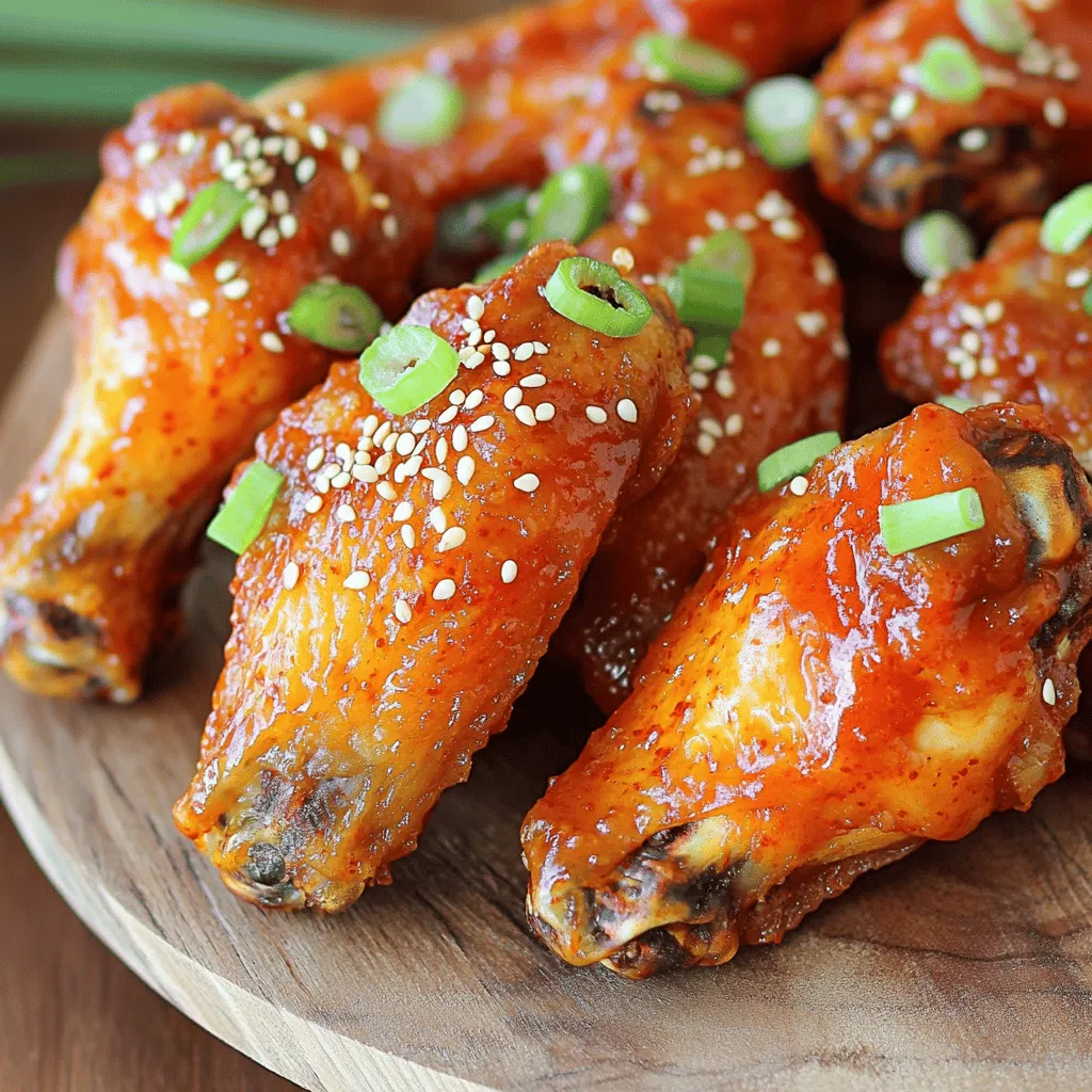 - 2 lbs chicken wings - 1 cup cornstarch - 1 teaspoon salt - 1/2 teaspoon black pepper - 1/2 teaspoon garlic powder - 1/2 teaspoon onion powder - 1/4 teaspoon cayenne pepper - Vegetable oil (for frying) For the BBQ Sauce: - 1/2 cup gochujang (Korean red pepper paste) - 1/4 cup honey - 2 tablespoons soy sauce (low sodium) - 2 tablespoons rice vinegar - 1 tablespoon sesame oil - 1 tablespoon grated ginger - 2 cloves garlic, minced - 1 teaspoon sesame seeds (for garnish) - Sliced green onions (for garnish) - Sesame seeds - Sliced green onions Gather these ingredients first. The chicken wings will be the star of this dish. The cornstarch mixture gives them that perfect crisp. The BBQ sauce adds a rich and spicy flavor that you will love. The garnishes are not just for looks; they add a nice crunch and flavor, too. - Rinse and Dry the Chicken Wings: Start by rinsing the chicken wings under cold water. This removes any unwanted bits. Next, pat them dry with paper towels. Dry wings help create that crispy skin we all love. - Prepare the Seasoned Cornstarch: In a large bowl, mix together 1 cup of cornstarch, 1 teaspoon of salt, 1/2 teaspoon of black pepper, 1/2 teaspoon of garlic powder, 1/2 teaspoon of onion powder, and 1/4 teaspoon of cayenne pepper. This mix adds flavor and crunch. - Frying the Chicken Wings: In a deep frying pan, heat about 2 inches of vegetable oil. The oil should be at 350°F (175°C). Carefully add the wings, frying them in batches. Cook for 8 to 10 minutes until they are golden brown and crispy. Don’t overcrowd the pan, or they won’t cook right. - Preparing the BBQ Sauce: While the wings fry, make the BBQ sauce. In a small saucepan, mix 1/2 cup of gochujang, 1/4 cup of honey, 2 tablespoons of low-sodium soy sauce, 2 tablespoons of rice vinegar, 1 tablespoon of sesame oil, 1 tablespoon of grated ginger, and 2 cloves of minced garlic. Heat this over medium heat, stirring until it thickens a bit. - Coating the Wings with Sauce: Once your wings are golden and crispy, take them out of the oil and place them on a paper towel-lined plate. This removes extra oil. In a large bowl, toss the hot wings with the BBQ sauce until they are fully coated. - Presentation Tips: Transfer the wings to a serving platter. Sprinkle sesame seeds and sliced green onions on top for a nice touch. This not only looks great but adds more flavor. Importance of Drying Chicken Before you fry, drying the chicken is key. Pat the chicken wings dry with paper towels. This step helps the skin get crispy. Moisture on the wings can make them soggy. Dry wings will fry better. Oil Temperature Management Heat your oil to about 350°F (175°C). Use a thermometer for best results. If the oil is too cool, the wings will absorb grease. If it’s too hot, they will burn. Fry in small batches. This keeps the oil temperature steady and helps the wings cook evenly. Marinating the Chicken For extra flavor, consider marinating the wings. You can marinate them in the BBQ sauce before frying. Let them sit for at least 30 minutes. This step adds depth to the taste. Adjusting Spice Levels If you like heat, add more cayenne pepper to the cornstarch mix. For a milder taste, use less gochujang in the sauce. You can also add honey for sweetness. Adjust the flavors to fit your taste buds. Cooking is all about your preferences! {{image_2}} Sweet and Spicy Variation You can change the BBQ sauce to add more flavor. Mix in some brown sugar or maple syrup to make it sweeter. Add more gochujang for extra heat. This gives your wings a sweet and spicy kick. You can also add a splash of lime juice for a zesty twist. Soy-Garlic Glaze Option If you want a different taste, try a soy-garlic glaze. Combine soy sauce, minced garlic, and a bit of honey in a pot. Heat it until it thickens slightly. This sauce adds a savory flavor that pairs well with the crispy wings. Toss the cooked wings in this glaze for a unique twist. Oven-Baked Version You can bake the wings instead of frying them. Preheat your oven to 425°F (220°C). Arrange the coated wings on a baking sheet lined with parchment paper. Bake them for 40-45 minutes, flipping halfway through. This method gives you crispy wings with less oil. Air Fryer Instructions Using an air fryer is a quick and healthier option. Preheat your air fryer to 400°F (200°C). Place the wings in a single layer in the basket. Cook for about 25-30 minutes, shaking the basket halfway through. This method gives you crispy wings without all the oil. - Best Practices for Refrigeration: Store any leftover chicken wings in an airtight container. This keeps them fresh and tasty. Place them in the fridge within two hours of cooking. They will stay good for about three days. If you want to keep them longer, consider freezing. - Freezing Tips: For freezing, let the wings cool completely. Then, place them in a freezer-safe bag. Remove as much air as possible before sealing. Label the bag with the date. These wings can last up to three months in the freezer. - Oven vs. Microwave: I recommend using the oven for reheating. Oven reheating keeps the wings crispy. Preheat the oven to 375°F (190°C). Place the wings on a baking sheet and heat for about 10-15 minutes. If using the microwave, expect softer skin. Heat for one minute, check, then heat in 30-second bursts until warm. - Maintaining Crispiness when Reheating: To keep wings crispy, don’t cover them when reheating. Covering traps steam, making them soggy. If using the oven, a wire rack can help. Place wings on the rack over the baking sheet to allow air to circulate. Enjoy your crispy wings again! How to make wings extra crispy? To make wings extra crispy, start with dry wings. Rinse them and pat dry. Next, coat them well in seasoned cornstarch. Fry them in hot oil, around 350°F. Frying in small batches keeps them crispy. Can I use frozen chicken wings? Yes, you can use frozen chicken wings. Just make sure to thaw them completely. Dry them well before coating them. T