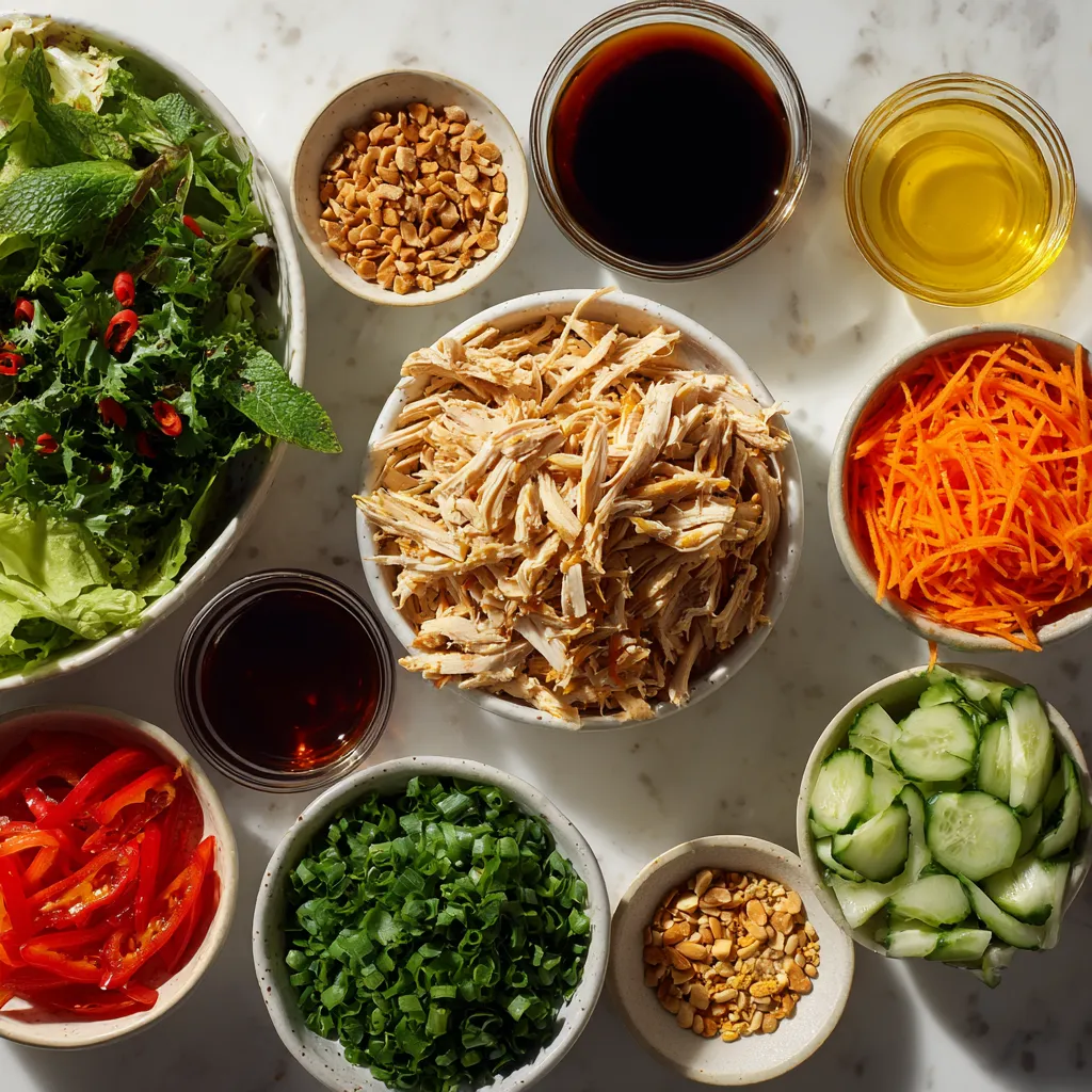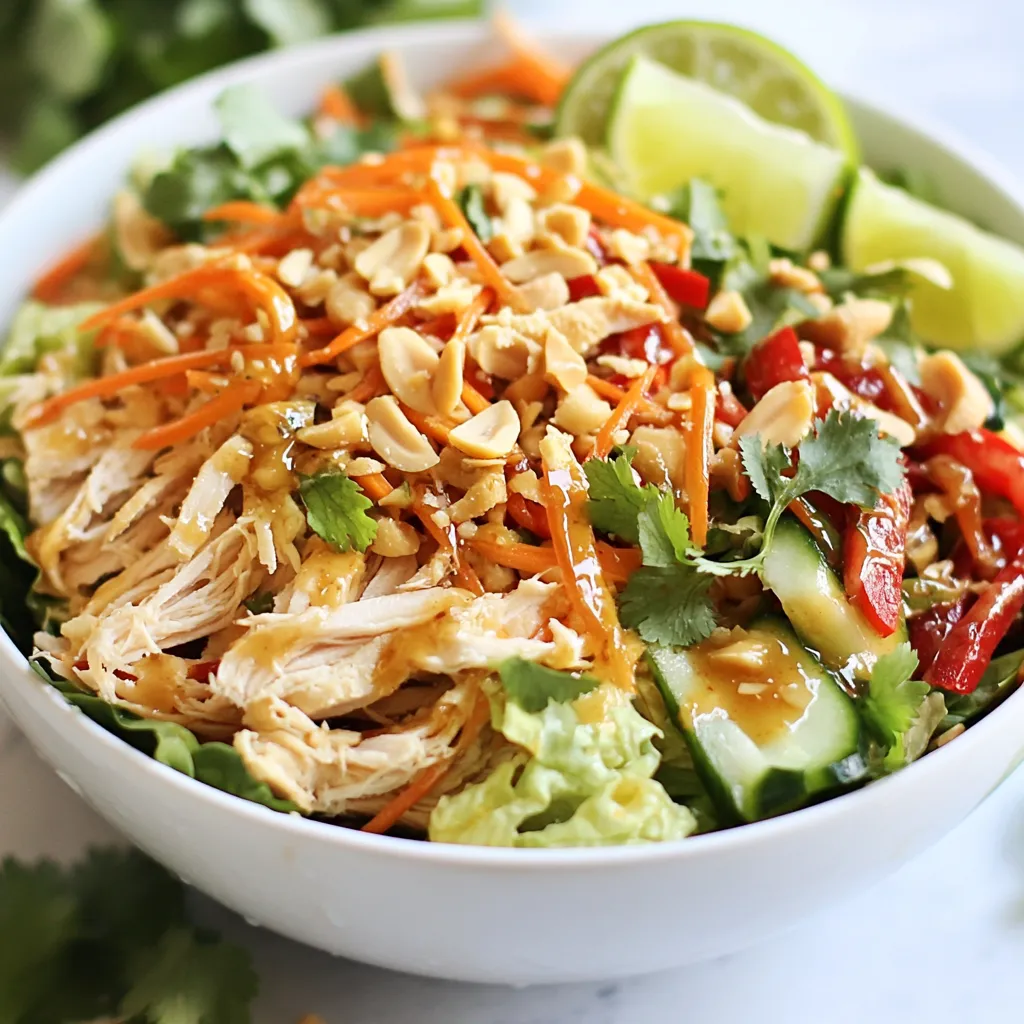A refreshing and vibrant salad featuring shredded chicken, mixed greens, and a zesty Thai dressing.