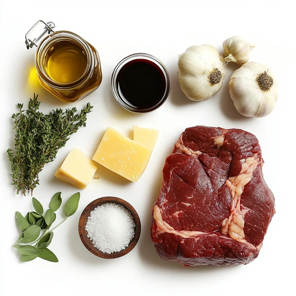 Now, let’s move to the flavor enhancers. We will use four cups of beef broth. This keeps the roast moist and adds depth. Two tablespoons of balsamic vinegar will balance the meat’s richness. Dried thyme and two bay leaves bring a lovely aroma. Lastly, we will season with salt and pepper. When serving, top the roast with a cup of shredded Gruyère cheese. It melts beautifully and adds a creamy note. Fresh parsley makes for a nice garnish and adds color.