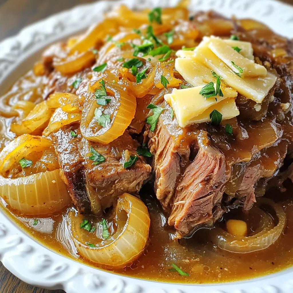 A delicious pot roast infused with caramelized onions and savory flavors, topped with melted Gruyère cheese.