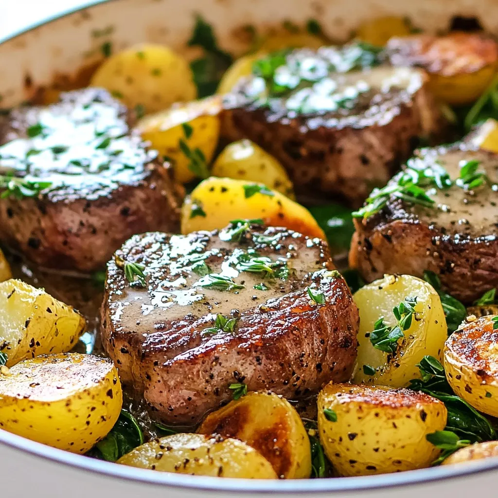 A delicious skillet dish featuring tender steak and crispy potatoes, all coated in a rich garlic butter sauce.
