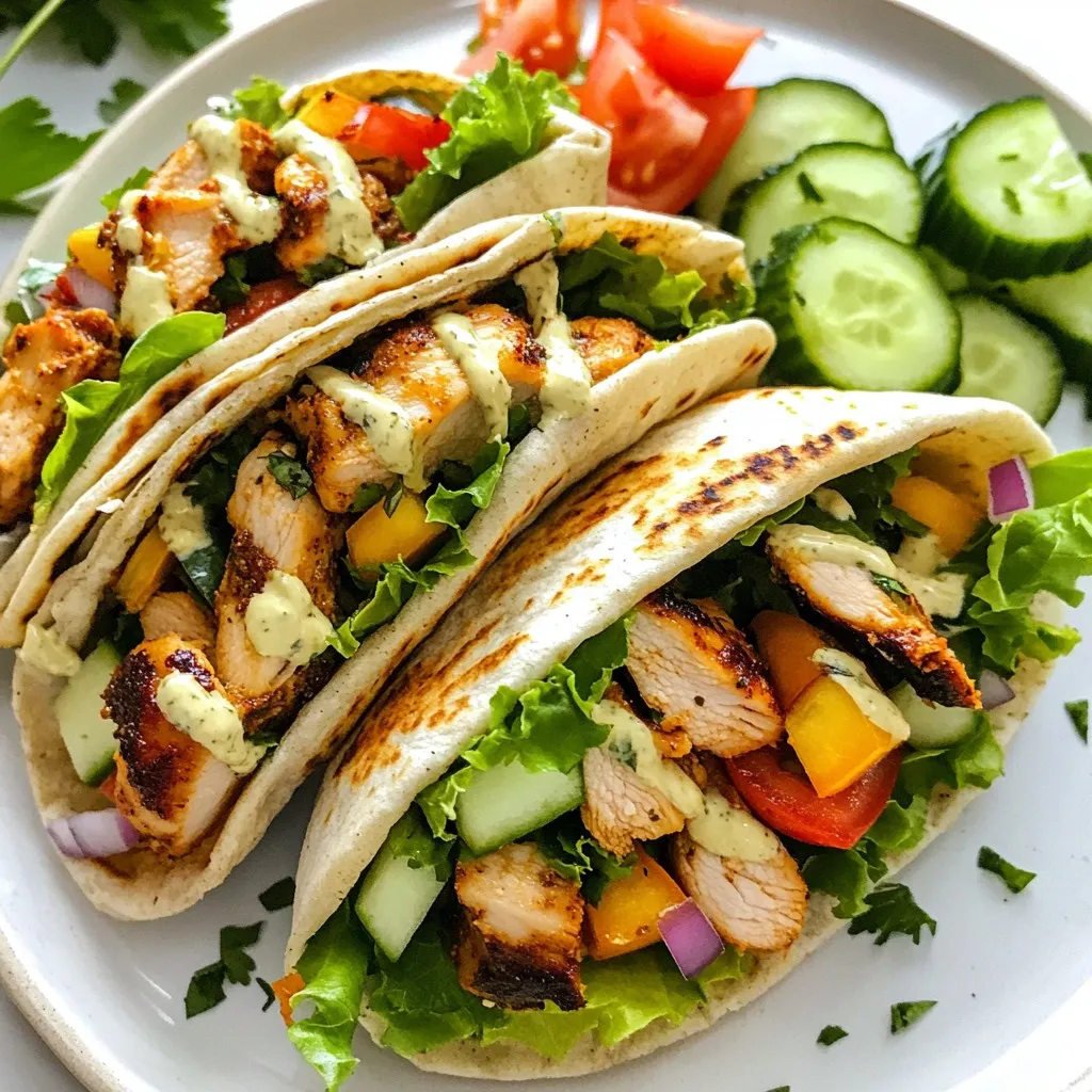 Now, let’s make our wraps! First, warm the pita breads on the grill or in a pan for about a minute on each side. This makes them soft and easy to roll. Next, lay down a layer of shredded lettuce, diced tomatoes, diced cucumber, and thinly sliced red onion on each pita. Add the sliced garlic chicken on top. Finally, drizzle with tahini sauce or garlic sauce.