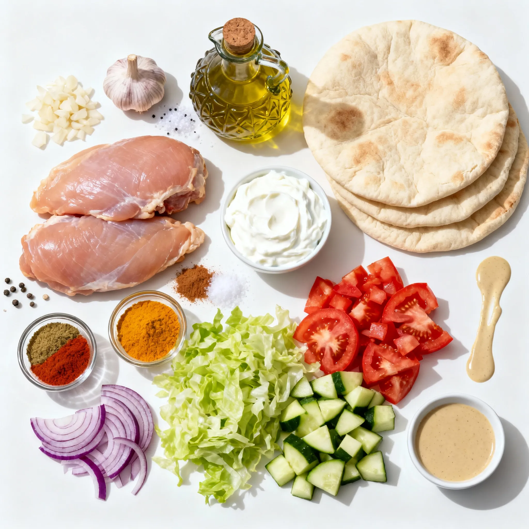 Gather your ingredients for a tasty garlic chicken shawarma wrap. Here’s what you need: