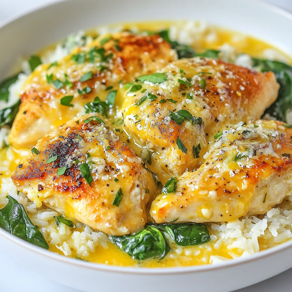 A delicious and comforting dish featuring chicken breasts cooked with garlic, rice, and Parmesan cheese, topped with fresh spinach.