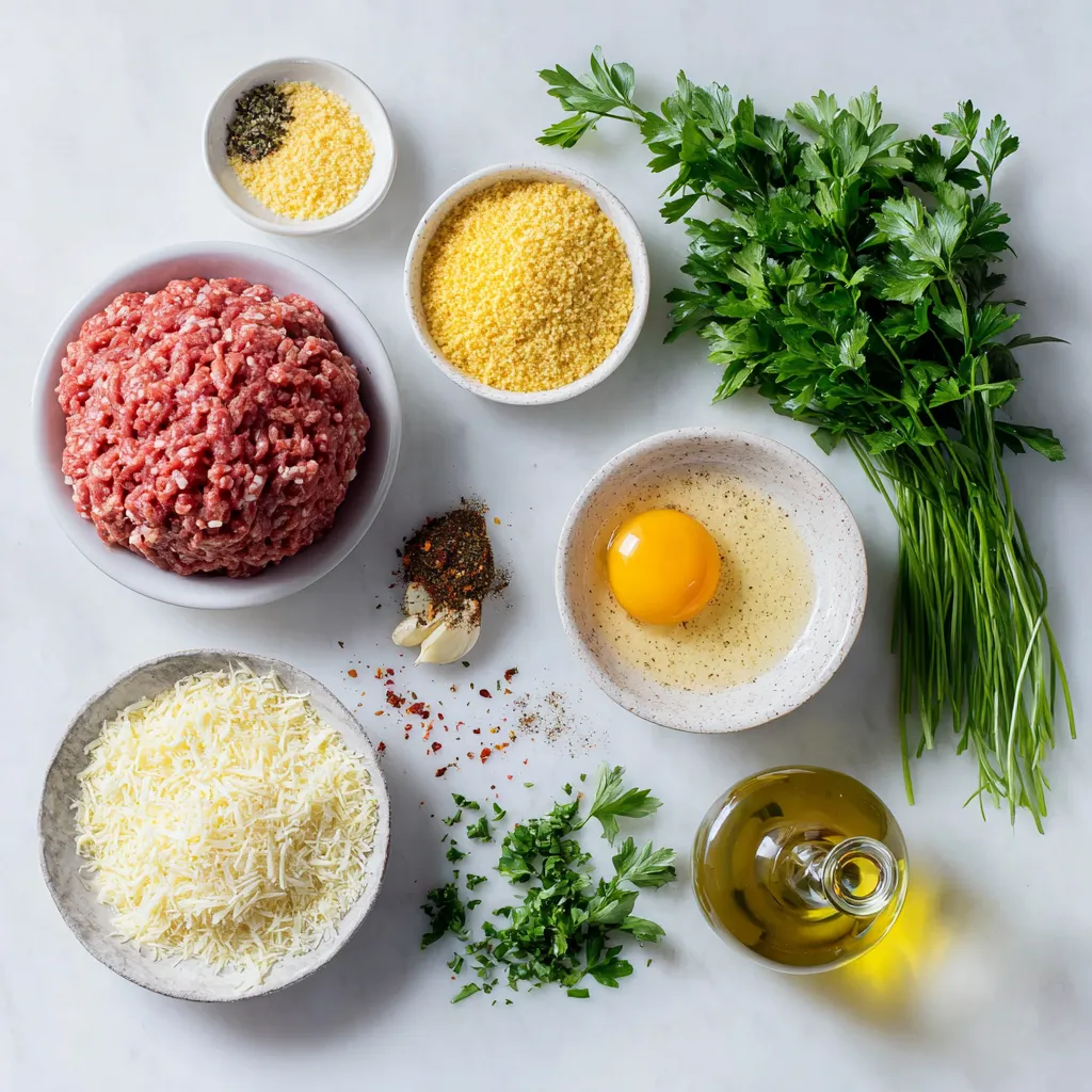To start, gather a large mixing bowl. Add the ground beef, breadcrumbs, and grated Parmesan cheese. Next, toss in the chopped parsley and minced garlic. Crack the egg into the bowl, then sprinkle in the Italian seasoning, salt, black pepper, and red pepper flakes if you want a kick.