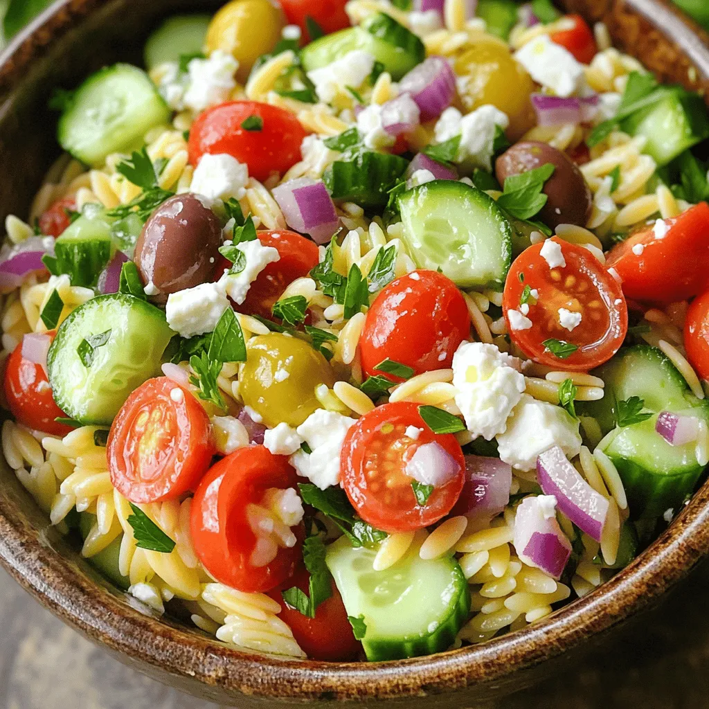 To make a vibrant Greek Orzo Salad, gather these fresh ingredients:
