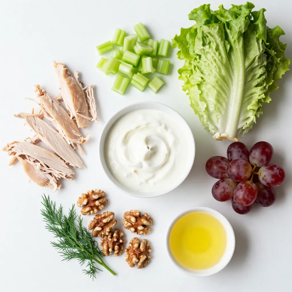 Start by shredding 2 cups of cooked chicken breast. I love using leftover chicken for this. In a mixing bowl, add the shredded chicken and 1 cup of plain Greek yogurt. This yogurt gives a creamy texture and adds protein. Next, chop 1/4 cup of celery finely. Add that to the bowl. Now, take 1/4 cup of red grapes and cut them in half. Toss those in too. Chop 1/4 cup of walnuts roughly and add them for a nice crunch. You can also mix in 2 tablespoons of fresh dill for flavor. Squeeze 1 tablespoon of lemon juice into the mix. This adds a zesty kick. Finally, season with salt and pepper to taste. Mix everything well until combined.