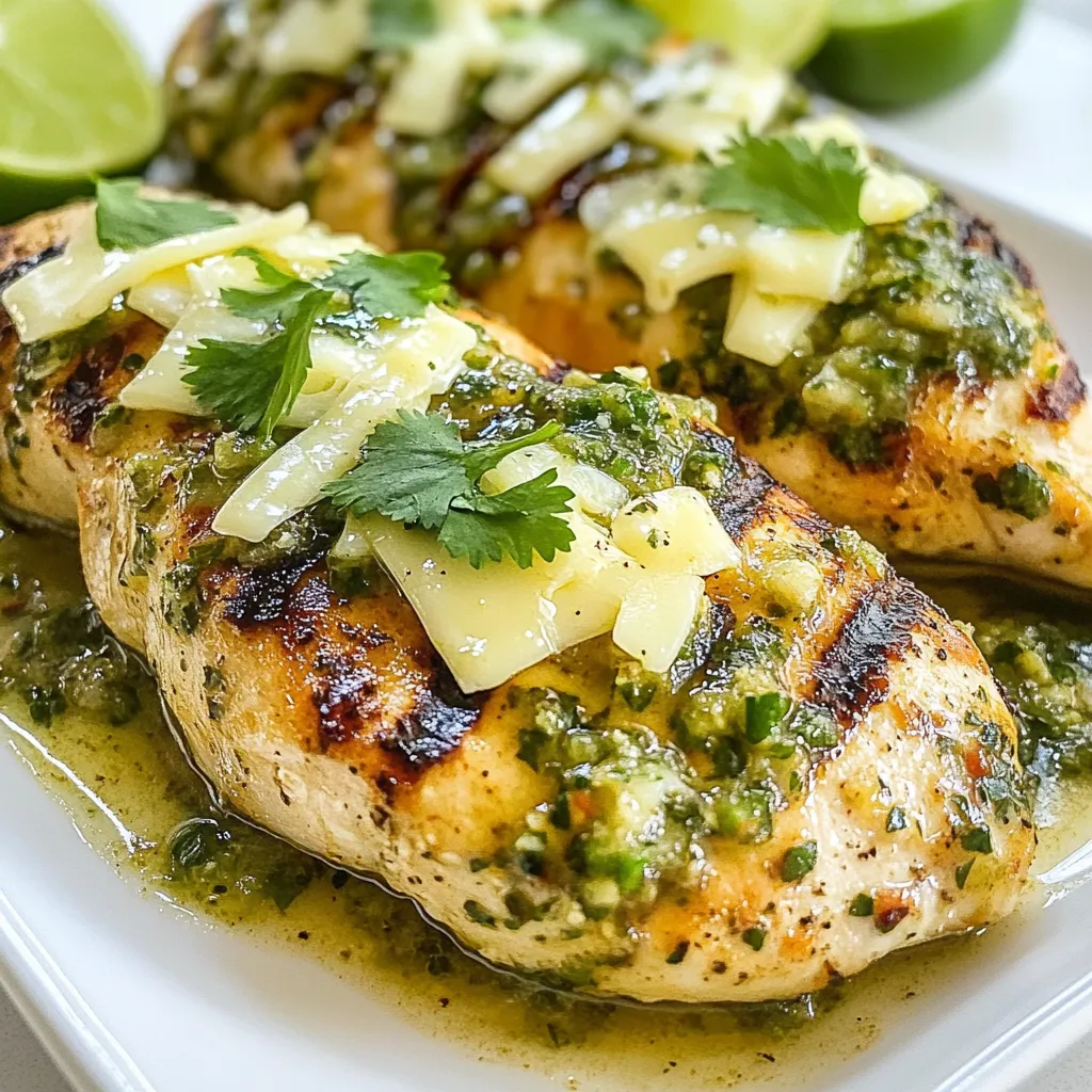 To create the best grilled salsa verde pepper jack chicken, gather these ingredients: - 4 boneless, skinless chicken breasts - 1 cup salsa verde - 1 cup shredded pepper jack cheese - 2 tablespoons olive oil - 1 teaspoon garlic powder - 1 teaspoon cumin - 1 teaspoon smoked paprika - Salt and pepper to taste These ingredients work together to make a dish full of bold flavors. The chicken breasts are the main part. They soak up the marinade well. The salsa verde adds a fresh kick. The pepper jack cheese melts beautifully on top. For extra flair, consider these garnishes and serving ideas: - Fresh cilantro, chopped - Lime wedges Chopped cilantro gives a fresh taste. The lime juice adds brightness to each bite. Serve the chicken with a side salad or rice for a complete meal. You can also pair it with tortilla chips for a fun crunch. You can swap some ingredients for different flavors: - Use chicken thighs instead of breasts for more juiciness. - Try green salsa if you want a different salsa type. - Use Monterey Jack cheese if you prefer a milder flavor. These substitutions still keep the dish tasty while letting you customize it. Adjust to your liking and get creative with flavors. {{ingredient_image_1}} To start, grab a large bowl. Mix 2 tablespoons of olive oil, 1 teaspoon of garlic powder, 1 teaspoon of cumin, and 1 teaspoon of smoked paprika. Add salt and pepper to taste. Place the 4 boneless, skinless chicken breasts into the bowl. Make sure each piece is well coated in the marinade. Cover the bowl and refrigerate it for at least 30 minutes. For even more flavor, let it marinate up to 2 hours. While the chicken marinates, preheat your grill to medium-high heat. If you use a charcoal grill, check that the coals glow bright and hot. This step is key for great grilling. A hot grill helps to sear the chicken, giving it nice grill marks and locking in juices. After marinating, take the chicken out of the fridge. Let any excess marinade drip off. Place the chicken on the hot grill. Cook it for about 6 to 7 minutes on one side. Flip the chicken over and grill for another 6 to 7 minutes. You want the internal temperature to reach 165°F (75°C). This ensures the chicken is fully cooked and safe to eat. When the chicken is nearly done, it’s time for the salsa verde. Spoon the salsa generously over each chicken breast. Let it warm for about two minutes. Then, sprinkle 1 cup of shredded pepper jack cheese on top. Close the grill lid and let it cook for one more minute. This step melts the cheese perfectly, adding creamy goodness to your dish. To get great flavor, marinate your chicken well. I mix olive oil, garlic powder, cumin, and smoked paprika in a bowl. This mix makes a great marinade. Coat the chicken breasts with it and cover the bowl. I let it sit in the fridge for at least 30 minutes. For even more flavor, I recommend marinating for up to 2 hours. This helps the spices soak in. For perfect grill marks, preheat your grill to medium-high heat. This ensures the chicken sears well. Place the chicken on the grill and don’t move it for the first 3-4 minutes. This helps form nice grill lines. After that time, flip it and wait for another 6-7 minutes. Always check the internal temperature. It should reach 165°F (75°C) for safe eating. Timing is key when adding cheese. I spoon salsa verde onto the chicken two minutes before it’s done cooking. This warms the salsa and adds flavor. Then, sprinkle shredded pepper jack cheese on top. Close the grill lid and cook for one more minute. This gives the cheese just enough time to melt perfectly. Enjoy the gooey goodness! Pro Tips Marinate for Maximum Flavor: Allow the chicken to marinate for at least 2 hours to achieve a deeper flavor profile. Overnight is even better! Check Doneness with a Thermometer: Use a meat thermometer to ensure the chicken reaches an internal temperature of 165°F (75°C) for safe consumption. Customize Your Salsa Verde: Feel free to blend in some fresh herbs, jalapeños, or spices to tailor the salsa verde to your taste preferences. Rest Before Serving: Let the grilled chicken rest for a few minutes after cooking. This helps retain juices and enhances flavor. {{image_2}} You can switch the cheese to suit your taste. Try using mozzarella for a milder flavor. Cheddar adds a nice sharpness. If you love blue cheese, sprinkle some on top for a bold kick. Each cheese brings its own twist to the dish, making it exciting every time. Want more heat? Add some chopped jalapeños to the salsa verde. You can mix in diced green chiles for a smoky touch. If you like it really hot, sprinkle red pepper flakes over the chicken before grilling. These spicy additions will make your taste buds dance with joy. This dish pairs well with many bases. Serve it over fluffy rice to soak up the salsa verde. For a lighter option, place it on a bed of fresh salad greens. You can even use it in tacos for a fun twist. Each base adds a unique flavor and texture to your meal. To store leftover grilled chicken, let it cool first. Place the chicken in an airtight container. You can keep it in the fridge for up to four days. Adding a slice of lime can help keep flavors fresh. When you're ready to eat, reheat the chicken gently. You can use a microwave or an oven. If using a microwave, heat on medium power for 1-2 minutes. For oven reheating, wrap the chicken in foil and heat at 350°F for about 10 minutes. This keeps the chicken moist. If you want to save it longer, freeze the chicken. Wrap each piece tightly in plastic wrap, then place them in a freezer bag. It can last up to three months in the freezer. When ready to eat, thaw it overnight in the fridge. Reheat as mentioned earlier, and enjoy! You should marinate the chicken for at least 30 minutes. This gives the chicken time to soak up the flavors. If you can, marinate for up to 2 hours for even better taste. Yes, you can use a different salsa if you want. Try mango salsa for a sweet twist, or use a spicy sa