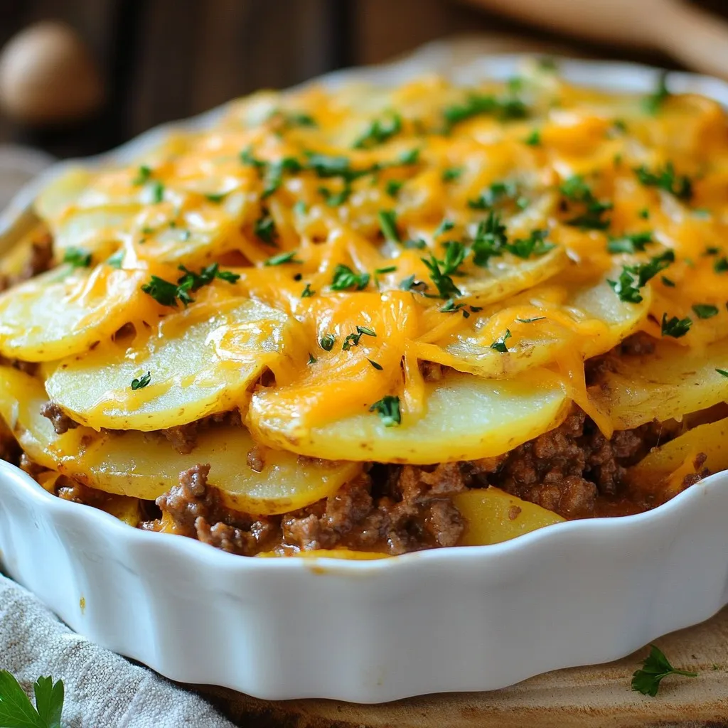 A hearty casserole featuring ground beef, layered with potatoes and mixed vegetables, topped with melted cheddar cheese.