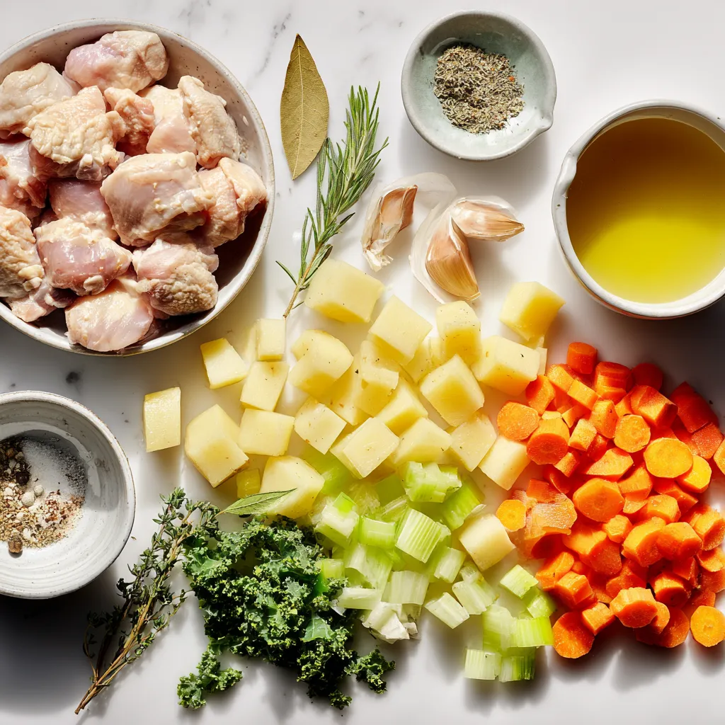 Cooking a great chicken soup with potatoes starts with fresh and simple ingredients. Here’s what you need: - 2 tablespoons olive oil - 1 lb boneless, skinless chicken thighs, diced - 1 medium onion, chopped - 2 cloves garlic, minced - 3 medium potatoes, diced - 3 carrots, sliced - 2 celery stalks, chopped - 6 cups chicken broth - 1 teaspoon dried thyme - 1 teaspoon dried rosemary - 1 bay leaf - Salt and pepper to taste - 1 cup fresh kale, chopped - Fresh parsley for garnish These ingredients make a rich and hearty soup. The chicken thighs add tenderness, while potatoes give it a satisfying bite. Fresh herbs bring out the flavors, and the kale adds a nice touch of color and nutrition. Use good-quality chicken broth for a deeper taste. Each item plays a role in creating that warm, comforting bowl of soup. {{ingredient_image_1}} Browning the chicken Start by heating the olive oil in a large pot over medium heat. Once hot, add the diced chicken thighs. Cook until they turn brown, which will take about 5 to 7 minutes. This step adds great flavor. Once browned, remove the chicken and set it aside. Sautéing onion and garlic In the same pot, add the chopped onion and minced garlic. Sauté them until the onion is soft and clear, which takes about 3 to 4 minutes. This step builds a nice base for your soup. Adding vegetables and broth Next, add the diced potatoes, sliced carrots, and chopped celery to the pot. Stir well to mix everything together. Then, pour in the chicken broth. Bring the mixture to a boil. This will help the flavors combine. Simmering and seasoning After boiling, return the browned chicken to the pot. Add the dried thyme, dried rosemary, bay leaf, salt, and pepper. Lower the heat to let it simmer for 20 to 25 minutes. This allows the vegetables to become tender and the flavors to meld. Final touches with kale After simmering, add the chopped kale to the soup. Cook for an additional 5 minutes until the kale wilts. This adds color and nutrients to your soup. Taste the soup and adjust the seasoning as needed. Don't forget to remove the bay leaf before serving. - Choosing the right chicken Use boneless, skinless chicken thighs. They cook well and stay juicy. If you prefer, you can use chicken breasts, but thighs add great flavor. - Fresh vs. dried herbs Fresh herbs give a bright taste. If you use dried herbs, use less, as they are stronger. For this soup, thyme and rosemary work well either way. - Adjusting texture and flavor Want a thicker soup? Mash some potatoes in the pot. If you like it thinner, add more broth. Taste as you go to find your perfect balance. - Common mistakes to avoid Don’t rush the browning of the chicken. This step adds depth. Also, avoid overcooking the vegetables; they should be soft but still hold shape. Lastly, season gradually. You can always add more salt and pepper! Pro Tips Choose the Right Chicken: Using boneless, skinless chicken thighs adds flavor and keeps the meat tender. You can also use chicken breasts for a leaner option. Enhance the Flavor: Sautéing the onions and garlic in the pot before adding the other ingredients builds a flavorful base for your soup. Vegetable Variations: Feel free to mix in other vegetables like peas or corn for added texture and nutrition. Just adjust the cooking time accordingly. Storage Tips: This soup can be stored in the refrigerator for up to 3 days. To freeze, let it cool completely, then transfer to airtight containers for up to 3 months. {{image_2}} You can make your chicken soup unique with some fun changes. Here are some ideas: - Different herbs and spices: Try adding fresh basil or dill. These herbs add a nice twist to the flavor. You can also use smoked paprika for a hint of smokiness. - Alternative vegetables: Swap out potatoes for sweet potatoes or butternut squash. You can add green beans or peas for extra color and crunch. Each choice brings its own taste. - Adding grains or pasta: For a heartier soup, mix in some cooked rice, quinoa, or small pasta like orzo. These grains make the soup more filling. Just be sure to adjust the broth as needed. - Making it creamy: If you love creamy soup, stir in some heavy cream or coconut milk at the end. This gives a rich texture and makes every bite feel special. Feel free to explore these variations. They let you create a soup that fits your taste perfectly. Enjoy your cooking adventure! Refrigerating leftovers After enjoying your chicken soup, cool it down first. Place it in an airtight container. It will stay fresh for about 3 to 4 days in the fridge. Freezing tips If you want to save some soup for later, freezing is a great choice. Use freezer-safe containers or bags. Leave some space at the top for expansion. The soup can last up to 3 months in the freezer. Reheating instructions When you're ready to enjoy the soup again, thaw it overnight in the fridge. Heat it on the stove over low heat. Stir often to ensure even warming. You can also use a microwave. Just heat in short bursts, stirring in between. Shelf life considerations If stored properly, the soup can last in the fridge for 3 to 4 days. In the freezer, it stays good for about 3 months. Always check for signs of spoilage, like an off smell or changes in color. Can I use breast instead of thighs? Yes, you can use chicken breast. It will be leaner, but may dry out faster. Thighs add more flavor and stay juicy. If you prefer breast, cook it just until done. How can I make it gluten-free? To make this soup gluten-free, use gluten-free chicken broth. Check labels on all ingredients. Fresh vegetables are naturally gluten-free, so you’re safe with those. What is the nutritional value? This soup is packed with nutrients. Each serving provides protein from chicken, fiber from veggies, and vitamins from kale. It is low in calories and high in flavor, making it a healthy choice. Can I add beans or lentils? Absolutely! Adding beans or lentils will boost protein and fiber. Canned beans can go in during the last 10