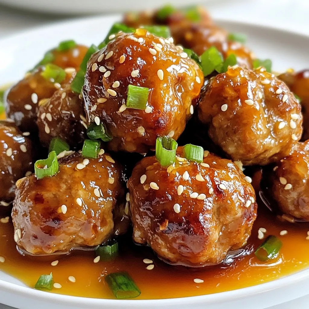 To make these sweet and savory meatballs, you need a few key items: - 1 pound ground beef (or turkey) - 1/2 cup breadcrumbs - 1/4 cup grated Parmesan cheese - 1/4 cup chopped green onions - 1 egg, lightly beaten - 2 cloves garlic, minced - 1 teaspoon salt - 1/2 teaspoon black pepper - 1/2 teaspoon Italian seasoning - 1/2 cup honey - 1/4 cup soy sauce (low-sodium) - 1 tablespoon sesame oil - 1 tablespoon rice vinegar - Sesame seeds and additional green onions for garnish These ingredients come together to create juicy meatballs and a rich sauce. The honey adds sweetness, while the soy sauce brings depth and umami. You can switch things up with some optional ingredients. Try adding: - Fresh herbs like parsley or cilantro for extra flavor. - Red pepper flakes for a spicy kick. - Chopped bell peppers or carrots for added crunch. These choices let you tailor the meatballs to your taste. If you need to make swaps, here are some ideas: - Use ground chicken or pork instead of beef or turkey. - Swap breadcrumbs for crushed crackers or oats for a gluten-free option. - Replace Parmesan with any hard cheese you have on hand. These substitutions keep the dish tasty while fitting your dietary needs. With these ingredients and tips, you'll create a delightful dish that everyone will enjoy! {{ingredient_image_1}} To start, gather your ingredients. In a large bowl, mix 1 pound of ground beef (or turkey) with 1/2 cup of breadcrumbs. Then, add 1/4 cup of grated Parmesan cheese and 1/4 cup of chopped green onions. Next, crack an egg and beat it lightly. Pour it into the mix along with 2 minced garlic cloves, 1 teaspoon of salt, 1/2 teaspoon of black pepper, and 1/2 teaspoon of Italian seasoning. Use your hands to mix everything well. Once it's combined, form the mixture into small meatballs, about 1 inch in size. Place them on a plate and set them aside. Now, let's prepare the sauce. In a small bowl, whisk together 1/2 cup of honey, 1/4 cup of low-sodium soy sauce, 1 tablespoon of sesame oil, and 1 tablespoon of rice vinegar. Set this sauce aside. Next, pour 1 cup of water into the Instant Pot and place a trivet inside. This keeps the meatballs above the water. Arrange the meatballs on the trivet in a single layer. Drizzle your honey garlic sauce over each meatball. Secure the lid on the Instant Pot. Set it to cook on high pressure for 10 minutes. After cooking, let the pressure release naturally for 5 minutes. Then, quick-release any remaining pressure and open the lid. Carefully remove the meatballs with tongs and place them on a serving platter. For a thicker sauce, switch the Instant Pot to 'Sauté' mode. Simmer the remaining sauce for 5 to 7 minutes. Once it thickens, drizzle it over the meatballs. For a nice finish, sprinkle sesame seeds and extra green onions on top. Enjoy your delicious honey garlic meatballs! For great meatballs, start with fresh meat. Use ground beef or turkey for the best taste. Mix your ingredients well in a bowl. This helps create a good texture. Make sure to add breadcrumbs and cheese for moisture and flavor. Form meatballs about one inch wide. This size cooks evenly and stays juicy. One mistake is packing the meat too tightly. This makes meatballs tough. Another error is not seasoning enough. Salt and pepper are key for flavor. Don’t skip the garlic and herbs. They add a nice touch to the taste. Lastly, avoid cooking meatballs directly in the water. Use a trivet to keep them above the liquid. To cook meatballs evenly, arrange them in a single layer on the trivet. This allows steam to circulate around each meatball. If you stack them, some may not cook through. Always use enough water—one cup is perfect. For best results, follow the cooking time closely. Letting the pressure release naturally helps keep them tender. Pro Tips Use Fresh Ingredients: Fresh garlic and green onions enhance the flavor of your meatballs significantly. Opt for fresh over dried for the best results. Alternate Protein: For a lighter version, substitute ground beef with ground turkey or chicken. Adjust the cooking time slightly if using leaner meats. Thicken the Sauce: If you prefer a thicker sauce, simmer it on the 'Sauté' mode for a longer duration, stirring occasionally to prevent burning. Freezing Meatballs: These meatballs freeze well! Prepare a double batch, cook them, and freeze them in sauce for an easy meal later on. {{image_2}} You can use different meats for your meatballs. Ground beef gives a rich flavor. Turkey makes them lighter and healthier. Chicken is another good choice. It adds a mild taste. Each meat brings its own twist. You can mix meats too for a unique flavor. Just remember to adjust cooking times if needed. The honey garlic sauce is sweet and savory. But you can change it up! Add sriracha for heat. A dash of red pepper flakes works well too. For a sweeter version, add more honey. You can even use teriyaki sauce for a fun twist. Each variation gives a new taste to the meatballs. You can serve these meatballs in many ways. Try them over steamed rice for a filling meal. Noodles are also great to pair with the meatballs. Toss in some stir-fried vegetables for extra crunch. You can even serve them as a tasty appetizer. The options are endless, so get creative! After enjoying your Instant Pot honey garlic meatballs, store leftovers safely. Let them cool down first. Then, place them in an airtight container. This keeps them fresh and tasty. Store them in the fridge for up to four days. If you have more to save, try freezing them instead. To reheat your meatballs, you have a few easy options. You can use the microwave. Place the meatballs on a plate and cover them with a damp paper towel. Heat for about one to two minutes. Check if they are hot all the way through. If not, heat them for more time. You can also reheat them on the stove. Add a bit of water or sauce to a pan, then add the meatballs. Heat on medium until warmed through, stirring often. Freezing meatballs is a great way 