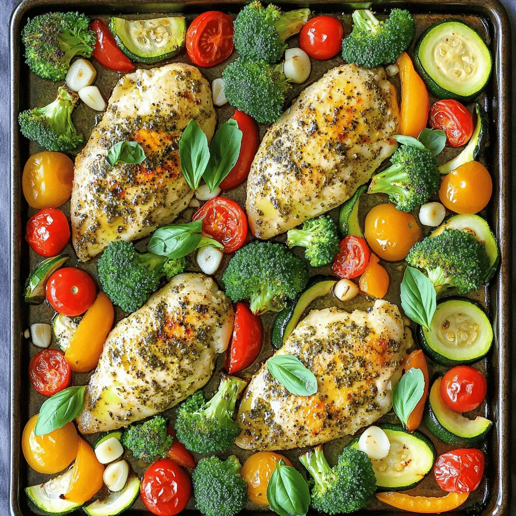 - 4 boneless, skinless chicken breasts - 2 cups broccoli florets - 2 cups cherry tomatoes, halved - 1 bell pepper (any color), sliced - 1 zucchini, sliced into half-moons - 1 red onion, cut into wedges - 4 cloves garlic, minced - 2 teaspoons dried Italian herbs (oregano, basil, thyme) - 1 teaspoon paprika - Salt and pepper to taste - 3 tablespoons olive oil - Fresh basil leaves Start by preheating your oven to 400°F (200°C). This temperature helps cook the chicken and veggies evenly. A hot oven makes sure everything roasts nicely. In a large bowl, toss together the broccoli, cherry tomatoes, bell pepper, zucchini, red onion, and minced garlic. Drizzle 2 tablespoons of olive oil over the mix. Then add salt, pepper, and half of the dried Italian herbs. Toss the veggies well to coat them with the oil and seasonings. This step brings out their fresh flavors. Take the chicken breasts and place them on a large sheet pan. Drizzle the remaining olive oil over them. Sprinkle the rest of the dried Italian herbs, paprika, salt, and pepper on top. Make sure to rub the spices into the chicken. This helps the chicken soak up all the great flavors. Arrange the seasoned chicken in the center of the pan. Spread the seasoned vegetables around the chicken. Now, it's time to bake! Place the sheet pan in the preheated oven. Bake for about 25-30 minutes. You want to check that the chicken reaches an internal temperature of 165°F (75°C). The veggies should be tender and golden. Once done, take it out and let the chicken rest for a few minutes. This will keep it juicy and tasty. If you’d like, garnish with fresh basil leaves before serving! To make sure your chicken is just right, check the internal temperature. Use a meat thermometer and aim for 165°F (75°C). This ensures the chicken is safe to eat and juicy. Once cooked, take it out and let it rest for a few minutes. This helps the juices settle, making the chicken tender and tasty. Feel free to mix and match your veggies. Seasonal choices like asparagus or carrots can add fun flavors. You can also use favorites like green beans or sweet potatoes. The key is to use veggies that cook well together. Cut them into similar sizes to ensure even cooking. Want to save time? Prep your veggies and chicken the night before. Chop the vegetables and marinate the chicken in olive oil and herbs. Store everything in the fridge. When you're ready to cook, just toss them on the sheet pan and bake. Leftovers also work great for lunch. Just store them in an airtight container in the fridge for up to three days. {{image_2}} You can easily swap chicken for other proteins. Try turkey breasts for a lighter taste. If you prefer plant-based options, go for tofu. Make sure to press the tofu to remove moisture for better flavor. You can marinate it just like the chicken. This keeps your dish tasty and healthy. Want to switch up the flavors? Use different spices like cumin or chili powder. You could also try a lemon-garlic marinade. Mix lemon juice with garlic and olive oil. This adds a zesty kick to your meal. Experimenting with different herbs can also change the taste. Fresh herbs like rosemary or thyme work great. For a fully vegetarian sheet pan meal, skip the chicken entirely. Instead, use more veggies. Add chickpeas for protein and texture. You can use the same spices to season your veggies. Toss the chickpeas and vegetables in olive oil and herbs. Bake them just like you would for the chicken. This way, you have a colorful, nutritious dish everyone will enjoy. To keep your Italian Herb Chicken Veggie Sheet Pan fresh, follow these steps: - Allow the meal to cool completely before storing. - Use airtight containers to prevent moisture loss. - Store in the fridge for up to 3 days. - Label containers with the date for easy tracking. When it's time to enjoy your leftovers, reheating is key. Here are my favorite methods: - Microwave: Place in a microwave-safe dish. Heat on high for 1-2 minutes. Check if it's warm all through. - Oven: Preheat the oven to 350°F (175°C). Place the meal in an oven-safe dish, cover with foil, and heat for 15-20 minutes. - Skillet: Heat a little olive oil in a skillet over medium heat. Add the leftovers and stir for a few minutes until warm. If you want to save some for later, freezing works well. Here’s how: - Cool the dish completely before freezing. - Use freezer-safe bags or containers. Remove as much air as possible. - Label with the date and type of meal. - Freeze for up to 3 months. To reheat, thaw overnight in the fridge before using your preferred reheating method. Bake the Italian Herb Chicken Veggie Sheet Pan for about 25 to 30 minutes. This time ensures the chicken cooks well and the veggies become tender. Always check the chicken's internal temperature. It should reach 165°F (75°C) for safety. If you have thicker chicken breasts, they may need a bit more time. Use a meat thermometer to be sure. Yes, you can make this dish ahead of time. Prep the chicken and veggies, then store them in the fridge. This way, you save time on a busy night. When ready to cook, just follow the baking steps. If you have leftovers, you can reheat them in the oven or microwave. Just ensure the chicken is heated through to 165°F (75°C) again. You can use a variety of veggies in this dish. Here are some great options: - Carrots - Asparagus - Cauliflower - Green beans - Sweet potatoes Feel free to mix and match based on your taste or what you have on hand. The key is to choose vegetables that roast well. This blog post guides you through creating a tasty Italian Herb Chicken Veggie Sheet Pan meal. We covered key ingredients like chicken and fresh veggies, along with herbs and seasonings. You learned step-by-step instructions for cooking, plus tips for perfectly cooked chicken. Don't forget the optional protein swaps and vegetarian options to suit your needs. With these easy steps and ideas, you can enjoy this healthy dish any time. Cooking should be fun, s