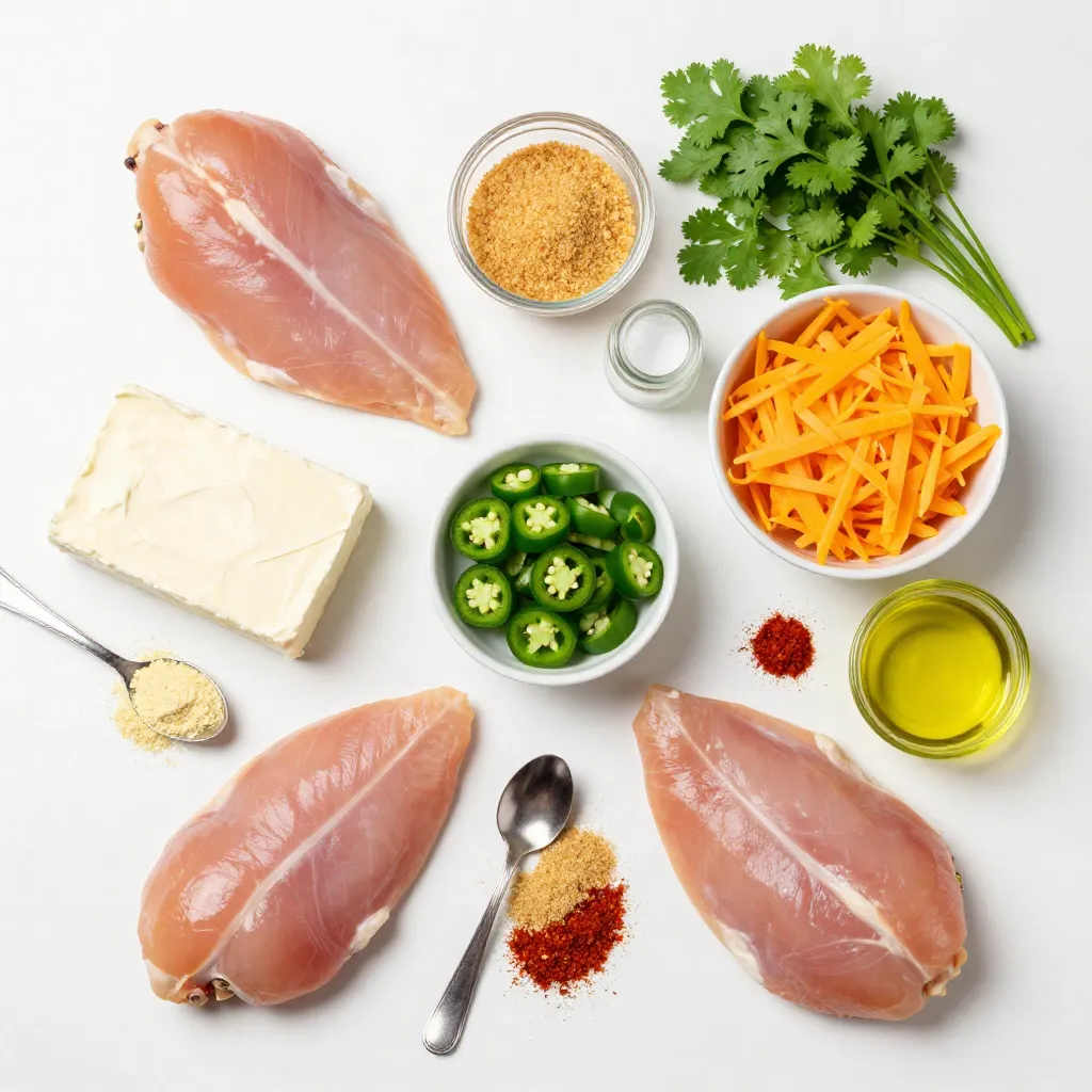 To make this tasty dish, you need just a few main ingredients: - 4 boneless, skinless chicken breasts - 4 oz cream cheese, softened - 1 cup shredded cheddar cheese - 1/2 cup finely chopped jalapeños (fresh or pickled) - 1/4 cup breadcrumbs - 1 tablespoon garlic powder - 1 tablespoon onion powder - 1 teaspoon smoked paprika - Salt and pepper to taste - 2 tablespoons olive oil These ingredients mix well to create a creamy, spicy filling that makes the chicken juicy. You can add fresh cilantro as a garnish. It adds a nice touch and brightens the dish. If you like, you can also drizzle a bit of hot sauce on top for extra zing. Always choose fresh chicken and high-quality cheeses. Fresh jalapeños give the best flavor. If you use pickled jalapeños, they add a nice tang. The cream cheese should be soft for easy mixing. Don’t skimp on the spices; they make the dish pop! {{ingredient_image_1}} Start by preheating your oven to 375°F (190°C). In a bowl, mix the cream cheese, shredded cheddar, chopped jalapeños, garlic powder, onion powder, smoked paprika, salt, and pepper. Stir until it’s smooth. Next, take your chicken breasts and carefully slice a pocket in each one. Don’t cut all the way through. Stuff each pocket with your jalapeño cheese mix. Press gently to keep the filling inside. Now it’s time to cook! In a shallow dish, add breadcrumbs and season them with salt and pepper. Dip each stuffed chicken breast in olive oil, then coat it with breadcrumbs. Press lightly to make sure they stick. Heat a large skillet over medium-high heat and add some olive oil. Place the stuffed chicken in the skillet and sear for 3-4 minutes on each side until golden brown. After searing, transfer the skillet to your preheated oven. Bake for 20-25 minutes, or until the chicken reaches 165°F (74°C). Once the chicken is baked, take it out of the oven and let it rest for a few minutes. This helps keep the juices inside. You can serve it hot, and if you like, garnish with fresh cilantro. It’s a great way to add color and a fresh taste! Enjoy this tasty meal with some sides like rice or a salad. To stuff chicken breasts well, take your time. First, use a sharp knife to slice a pocket. Cut carefully, so you don’t slice all the way through. Make the pocket big enough to hold the filling. Next, press the filling into the pocket gently. This keeps your mixture inside during cooking. Lastly, seal the opening with toothpicks if needed. This helps keep your delicious filling in place. You can boost flavor in your stuffed chicken easily. Try adding some spices, like cumin or chili powder, to the cheese mix. Fresh herbs, like cilantro or parsley, can add a fresh taste. For extra crunch, mix in some crushed tortilla chips with your breadcrumbs. You can also experiment with different types of cheese. Creamy goat cheese or tangy feta can create a unique flavor. One common mistake is overstuffing the chicken. Too much filling can cause it to spill out during cooking. Another mistake is not seasoning the chicken. Adding salt and pepper to the chicken helps enhance the taste. Also, don’t skip searing the chicken before baking. Searing adds a nice color and locks in moisture. Lastly, make sure your chicken reaches 165°F (74°C) for safe eating. Pro Tips Use Fresh Jalapeños: Fresh jalapeños will give your filling a vibrant flavor and a nice crunch. If you prefer less heat, remove the seeds and membranes before chopping. Seal the Chicken Properly: Make sure to seal the edges of the chicken pocket well to prevent the filling from leaking out during cooking. You can use toothpicks if necessary. Experiment with Cheese: While cheddar is delicious, feel free to mix in other cheeses like Monterey Jack or pepper jack for a different flavor profile. Each will add its unique twist to the dish! Let it Rest: Allow the chicken to rest for a few minutes after baking. This helps redistribute the juices and ensures that your chicken remains juicy and tender when sliced. {{image_2}} You can adjust the heat of your Jalapeño Popper Stuffed Chicken. If you like it spicy, use fresh jalapeños. They pack a punch! For a milder taste, opt for pickled jalapeños. They add flavor without too much heat. You can also remove the seeds from fresh jalapeños. This will lessen the spice while keeping the flavor. The cheese you choose can change the dish. Cream cheese is soft and creamy, but you can experiment with other cheeses. Try pepper jack for extra kick, or mozzarella for a milder option. You can even mix cheeses! A blend of cheddar and cream cheese works well too. You can also add spices to the cheese mix for extra flavor. Consider adding some ranch seasoning for a tasty twist. If you want a low-carb version, skip the breadcrumbs. Coat the chicken with almond flour or crushed pork rinds instead. These options give a nice crunch without the carbs. For gluten-free, always check the labels on your ingredients. Use gluten-free breadcrumbs or a suitable alternative. You can still enjoy this dish while sticking to your dietary needs. To keep your Jalapeño Popper Stuffed Chicken fresh, let it cool. After cooling, place it in an airtight container. Store it in the fridge. It should last for about 3 to 4 days. If you want to keep it longer, consider freezing. When you’re ready to enjoy leftovers, preheat your oven to 350°F (175°C). Place the chicken in an oven-safe dish. Cover it with foil to keep it moist. Heat for about 15 to 20 minutes, until warm throughout. You can also use a microwave. Just heat for 1 to 2 minutes. Make sure it is hot in the center. For meal prep, you can freeze the stuffed chicken. Wrap each piece tightly in plastic wrap. Place them in a freezer-safe bag or container. They can stay frozen for up to 3 months. When you’re ready to eat, thaw them in the fridge overnight before reheating. Yes, you can prepare Jalapeño Popper Stuffed Chicken ahead of time. After you stuff the chicken, wrap it tightly in plastic wrap