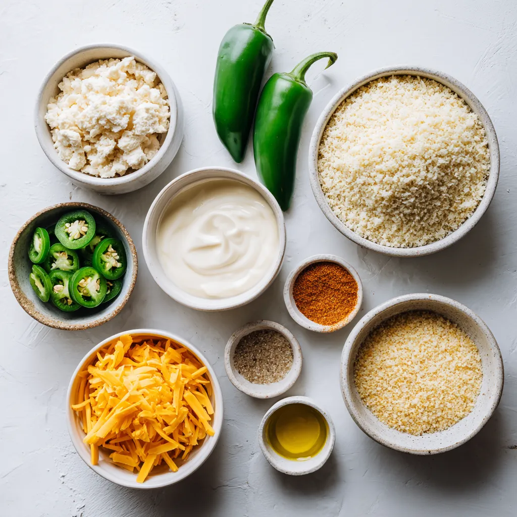 Start by gathering all your ingredients. You will need ground chicken, jalapeños, cream cheese, cheddar cheese, ranch dressing, garlic powder, onion powder, smoked paprika, salt, pepper, panko breadcrumbs, and olive oil.