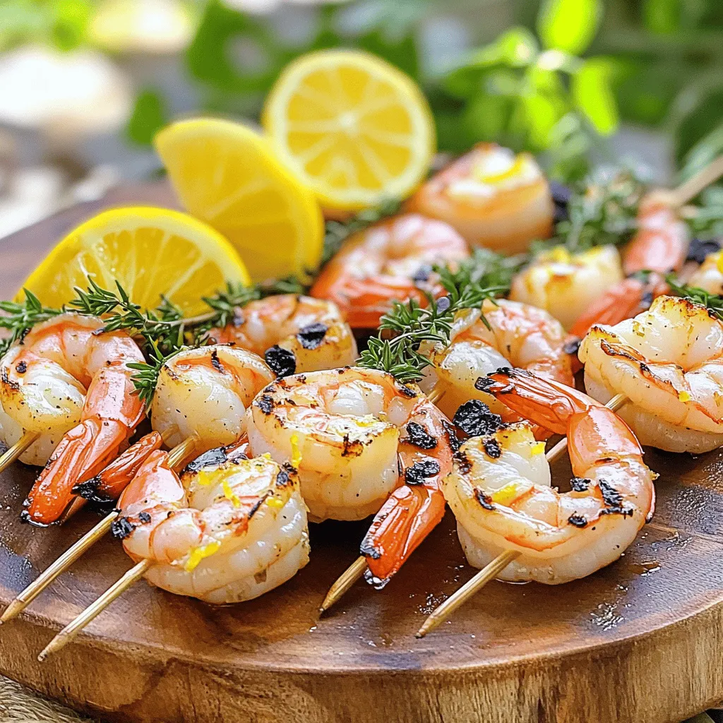 - 1 pound large shrimp, peeled and deveined - 3 tablespoons olive oil - Zest and juice of 1 lemon - 2 teaspoons fresh thyme leaves (or 1 teaspoon dried thyme) - 2 cloves garlic, minced - 1 teaspoon honey - Salt and pepper to taste To make Lemon Thyme Grilled Shrimp, you need fresh, high-quality ingredients. The shrimp should be large and fresh. The olive oil adds richness, while lemon zest and juice bring bright flavor. Fresh thyme enhances the dish with its earthy notes. Minced garlic provides a punch of flavor. Honey adds a hint of sweetness, balancing the acidity. Salt and pepper are essential for seasoning. - Lemon wedges - Fresh thyme sprigs These garnishes are more than just pretty additions. Lemon wedges give a fresh squeeze right before eating. Fresh thyme sprigs add a touch of color and flavor. They make your dish look vibrant and inviting. - Mixing bowl - Whisk - Grill or grill pan - Skewers These tools are key to your cooking process. A mixing bowl and whisk will help you combine ingredients well. A grill or grill pan is crucial for that smoky flavor. Skewers make grilling easier and keep your shrimp from falling through the grates. For the complete cooking steps, check the Full Recipe. To start, gather your ingredients. In a mixing bowl, combine the olive oil, lemon zest, lemon juice, fresh thyme, minced garlic, honey, salt, and pepper. Whisk them together until they mix well. Next, add the shrimp to the bowl. Toss the shrimp gently in the marinade. Cover the bowl and refrigerate for at least 30 minutes. You can marinate for up to 2 hours for a deeper flavor. While the shrimp marinates, prepare your grill. Preheat your grill to medium-high heat. If you use wooden skewers, soak them in water for about 30 minutes. This helps prevent them from burning on the grill. Once your grill is ready, it's time to cook. Take the marinated shrimp and thread them onto the skewers. Make sure not to overcrowd them. This ensures even cooking. Place the skewers on the grill. Grill the shrimp for about 2-3 minutes on each side. They are done when they turn pink and opaque. Avoid overcooking to keep them tender. After cooking, remove the shrimp and transfer them to a platter. You can find the full recipe here. For the best flavor, marinate the shrimp for at least 30 minutes. You can leave them for up to 2 hours if you want deeper taste. If you want to switch it up, try using a mix of yogurt and herbs for a creamier marinade or add a splash of soy sauce for a savory twist. To stop shrimp from sticking to the grill, make sure to preheat it. You can also brush the grill grates with a little oil. Grill shrimp over medium-high heat. This keeps them tender and juicy. The perfect temperature helps them cook evenly. Lemon thyme grilled shrimp taste great with a fresh salad or fluffy rice. Serve them with a light garlic sauce or a spicy aioli for extra flavor. You can also add grilled vegetables for a colorful plate. For the full recipe, check out the recipe section. {{image_2}} You can change the flavor of lemon thyme grilled shrimp with simple tweaks. Adding spices like paprika or cayenne gives a warm kick. You might enjoy the extra heat. Fresh herbs like basil or parsley can also switch things up. Both options lend a unique taste to the dish. If you want to try something different, you can swap shrimp for other seafood. Scallops or firm fish work great in this recipe. They cook well and absorb flavors nicely. For a land-based version, use chicken. Just adjust the cooking time to ensure it’s fully cooked. While grilling is a favorite, baking is another option. Preheat your oven to 400°F (200°C) and place the shrimp on a baking sheet. Bake for about 8-10 minutes, or until they turn pink. You can also cook shrimp on the stovetop. Heat a skillet over medium-high heat and add the marinated shrimp. Cook for about 2-3 minutes per side until done. Each method brings a different texture and taste to your meal. Don't forget to check out the Full Recipe for more details! To keep your Lemon Thyme Grilled Shrimp fresh, put leftovers in an airtight container. Store them in the fridge. They will stay tasty for up to three days. If you have marinated shrimp, they can last for about two hours in the fridge before cooking. Always remember to check for any off smells before using. If you want to save cooked shrimp for later, freezing is a great option. First, let the grilled shrimp cool completely. Then, place them in a freezer-safe bag. Remove as much air as possible from the bag to prevent freezer burn. The shrimp can last in the freezer for about three months. When you're ready to eat them, it's best to thaw them in the fridge overnight. This helps keep the shrimp's texture nice and firm. When reheating your grilled shrimp, aim for gentle heat to avoid overcooking. You can use a skillet on low heat. Just add a little olive oil and cook for a few minutes until warm. You can also use the microwave. Place the shrimp on a plate and cover them with a damp paper towel. Heat in short intervals of 30 seconds, checking often. Enjoy your Lemon Thyme Grilled Shrimp as if they were just made. Marinate your shrimp for at least 30 minutes. This time lets the flavors seep in. You can marinate for up to 2 hours if you want a stronger taste. Just remember, too long can make the shrimp mushy due to the lemon juice. Yes, you can use frozen shrimp. Just make sure to thaw them first. Place shrimp in the fridge overnight or run them under cold water. This helps keep them firm and tasty. Avoid using hot water, as it can cook the shrimp unevenly. Great sides include: - Grilled vegetables - Rice or quinoa - Fresh salad with lemon vinaigrette - Garlic bread These options add color and flavor, making your meal balanced and fun. This dish works well for meal prep. You can marinate the shrimp a day ahead. Cook them fresh the next day. Store any leftovers in the fridge for up to 2 days. When reheating, do it gently to avoid overcooking. For the