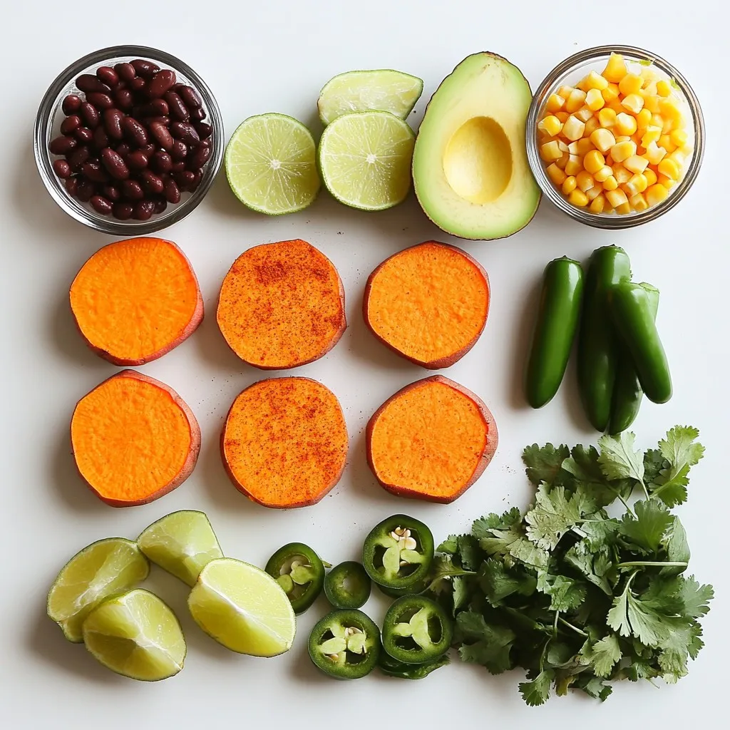 Layering is key for visual appeal. Start with a base of sweet potatoes. Add your black bean and corn mix. Next, sprinkle diced avocado and cheese on top. This creates a colorful look.