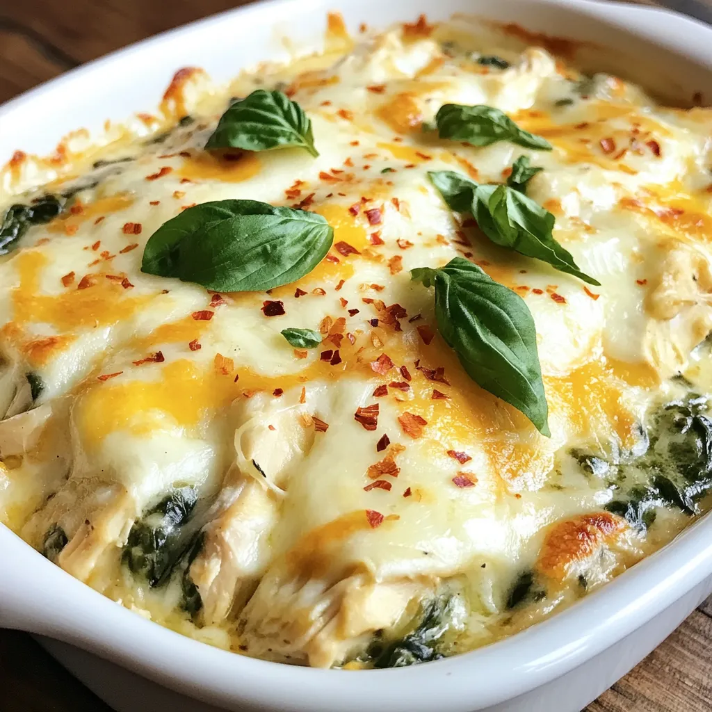 A delicious and creamy casserole made with chicken, spinach, and cheese.